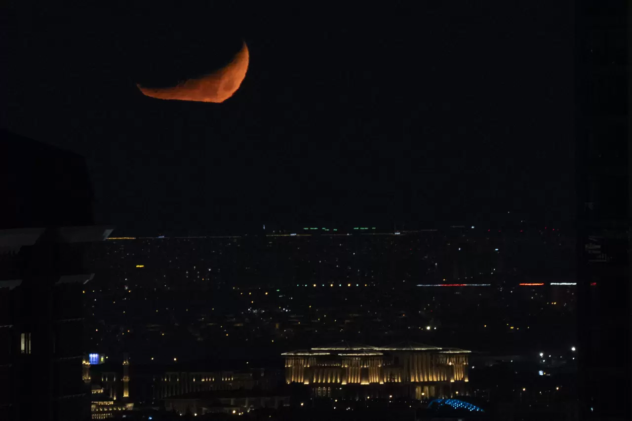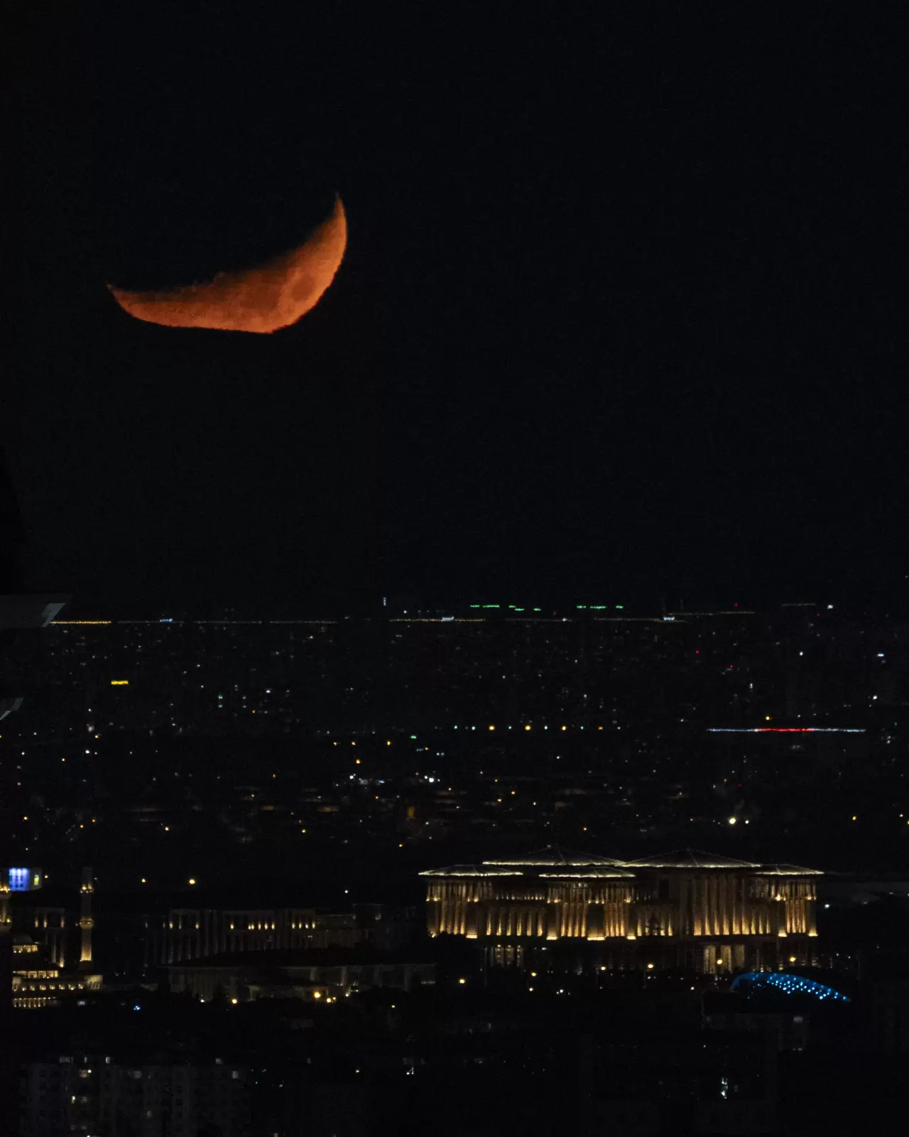 Hilalin, Cumhurbaşkanlığı Külliyesi ile aynı kareye yansıması ise ayrı bir güzellik oluşturdu. İki sembol, başkentteki tarihi yapılarla birlikte eşsiz bir uyum sergileyerek, gökyüzünün nadir anlarından birini izleyenlere sundu.