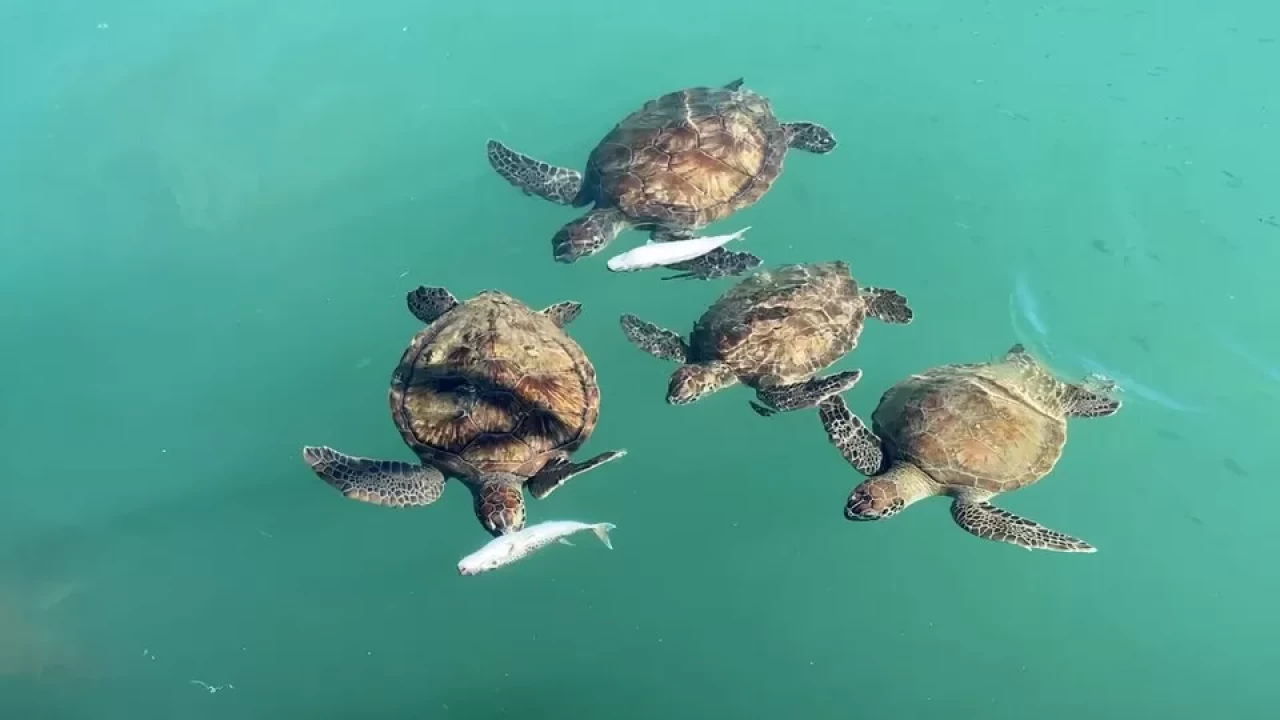 Sabahın erken saatlerinde ağlarını toplayarak dönen balıkçılara eşlik eden deniz kaplumbağaları onların bıraktıkları ıskarta balıklarla besleniyor. Özellikle balıkçıların ağlarını temizleme ve çıkarma esnasında ortaya çıkan büyüklü küçüklü kaplumbağalar renkli görüntüler oluşturuyor.