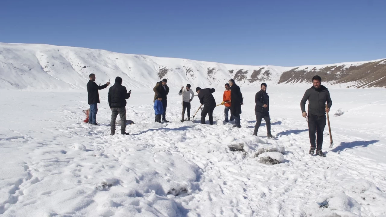 Sadece sazan türünde balıkların yaşadığı gölette vatandaşlar kazma ve küreklerle kalın buz tabakalarını kırarak balık avlıyor.