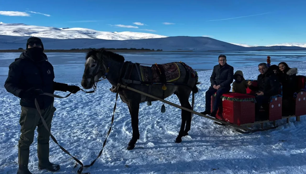 Çıldır Gölü’nün yaklaşık yüzde 10’luk bölümü buzla kaplanırken, bu alan yerli misafirlerin ilgisini çekti. Ziyaretçiler, donan göl yüzeyinde yürüyüş yaptı.