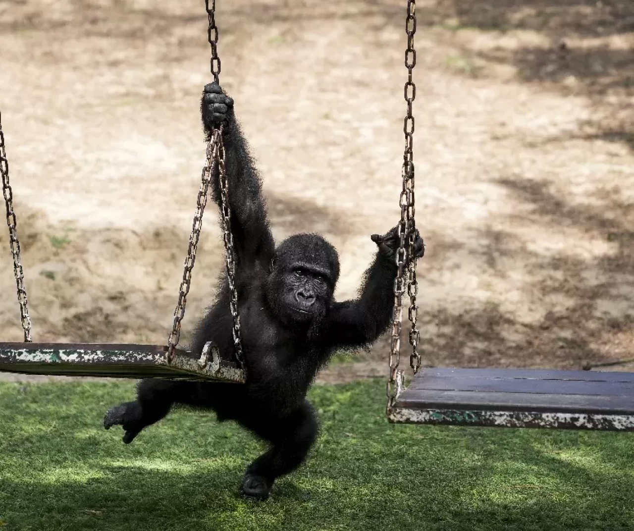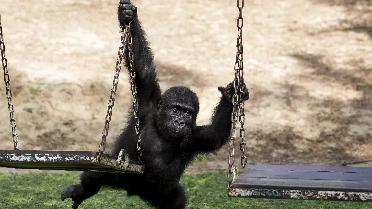 Nesli tükenme tehlikesi altında olan "gorilla gorilla" cinsi yavru, cam odada gözetim altından çıkarak, hayvanat bahçesindeki doğal alanında bakıcılarıyla birlikte oyun oynuyor.