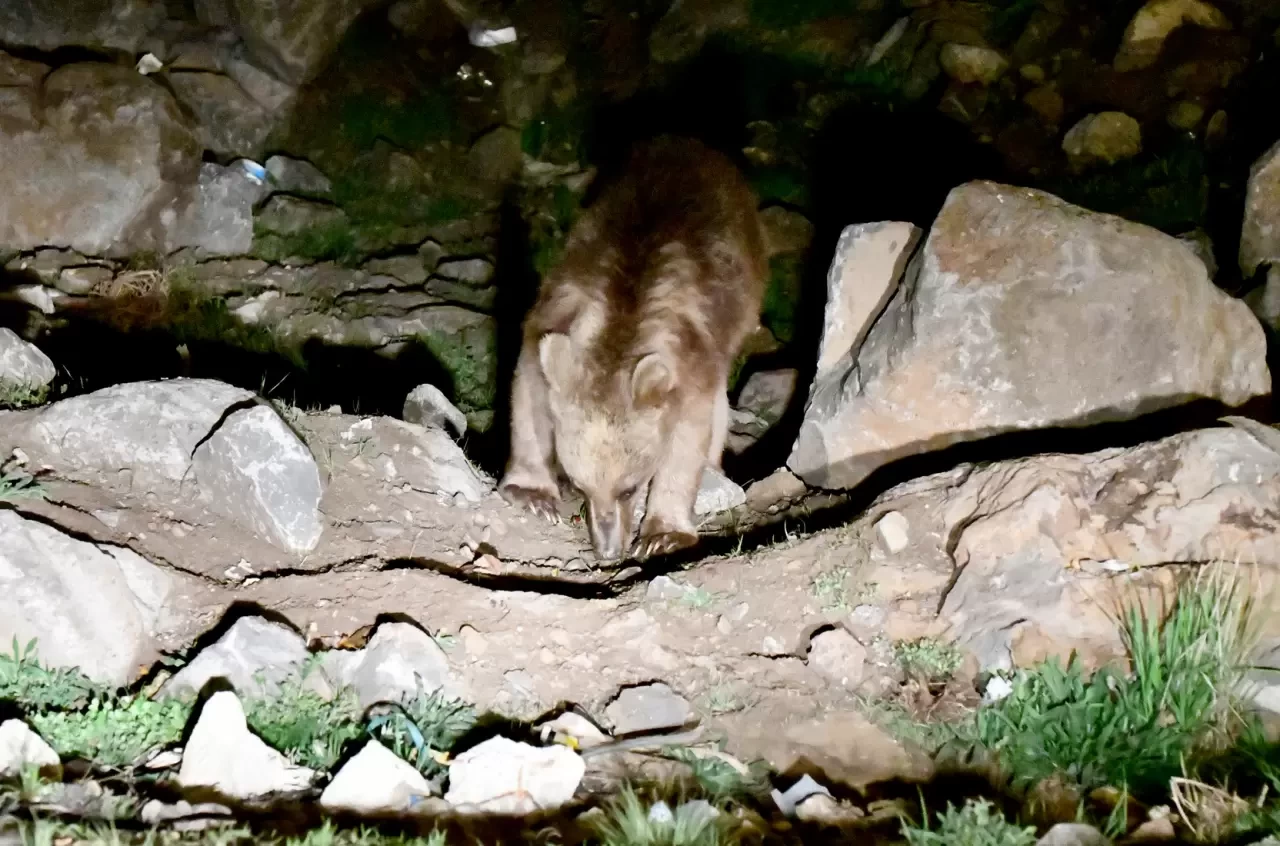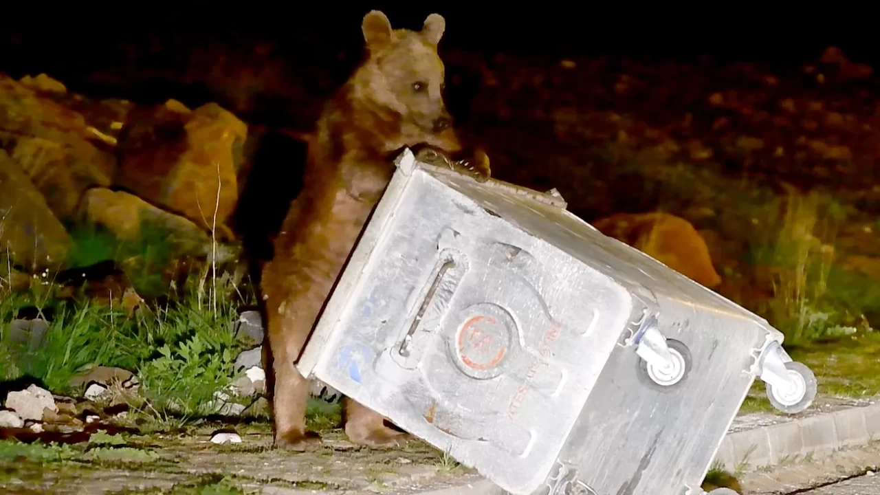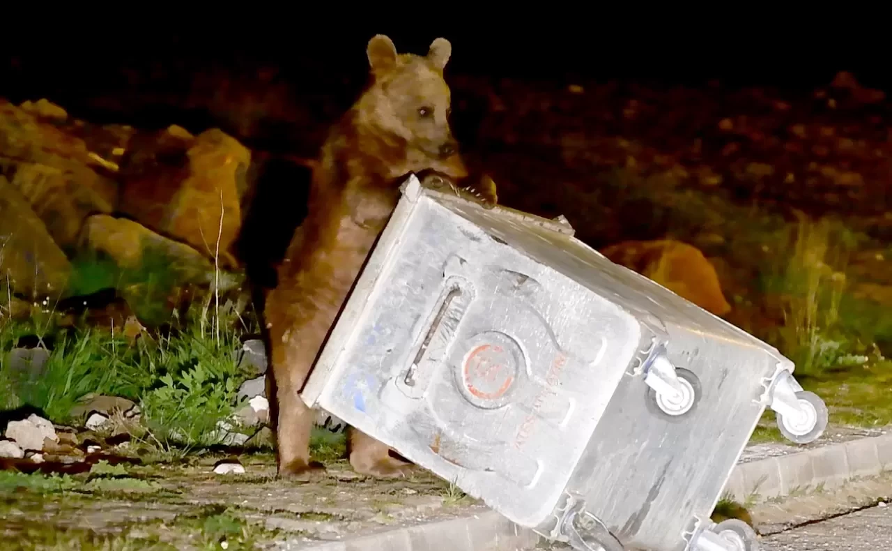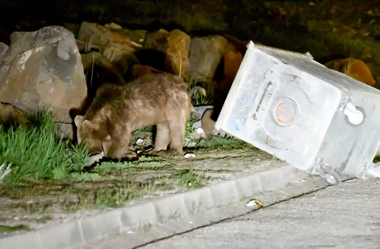 Ormanlık alandan Tepe Mahallesi Taşkıran TOKİ konutları bölgesine inen bir bozayı, çöp konteynerlerini devirip içine girerek yiyecek aradı.