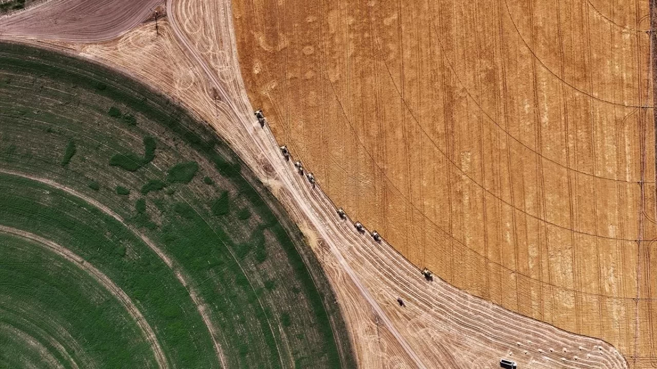 Tarlanın merkezini esas alan, yarı çap uzunluğundaki hareketli robotik sulama sistemine göre ekimin yapıldığı 492 dekarlık dairesel tarlalarda hasat, çok sayıda biçerdöverle gerçekleştirildi.