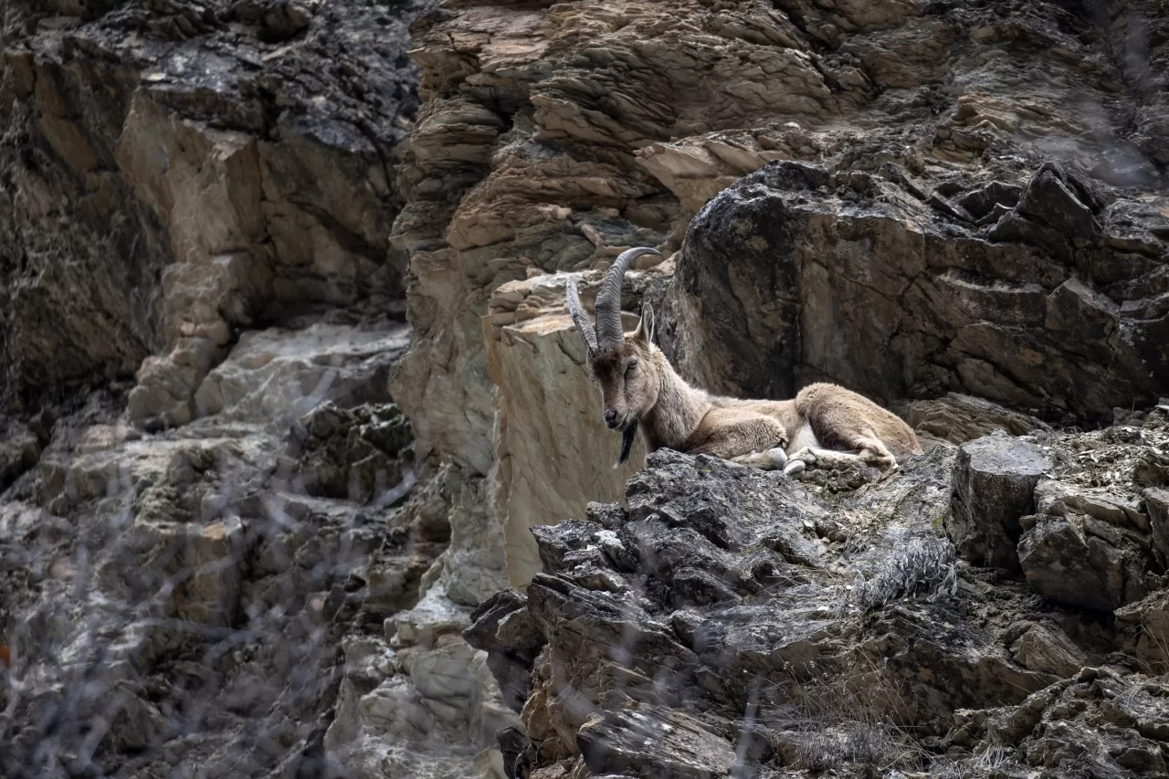 Güvenli buldukları noktaları mesken tutan yaban keçileri ve kış uykusundan uyanan bozayılar, meşe ormanlarıyla kaplı dağlarda yiyecek ararken görüntülendi.