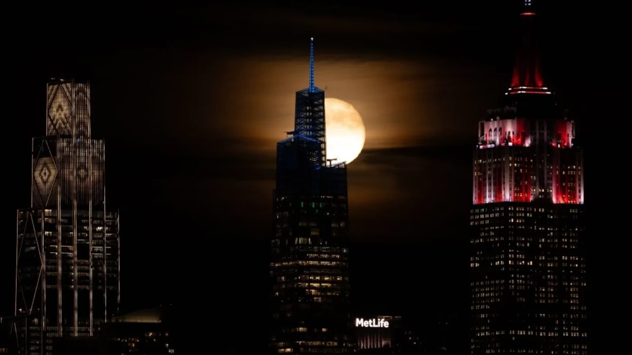 Manhattan semalarında yükselen dolunay, şehir silüetiyle birleşerek etkileyici kareler oluşturdu.