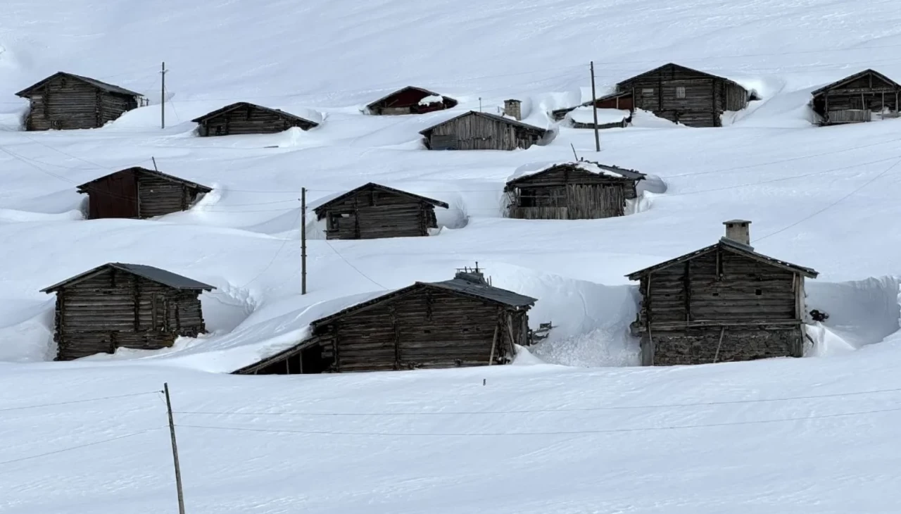 Ardahan-Şavşat kara yolunun Sahara mevkisi üzerindeki yayla evleri de karla kaplı bulunuyor.