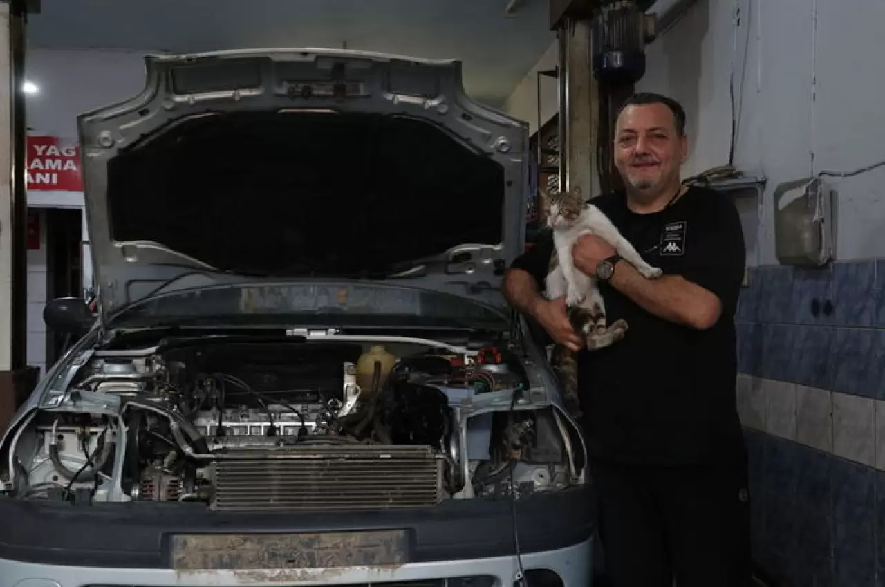 “Birlikte motor tamiri yapıyoruz,” diyen Şahinkaya, kedisinin kendisini yalnız bırakmadığını ve adeta bir yardımcı usta gibi çalıştığını dile getirdi.