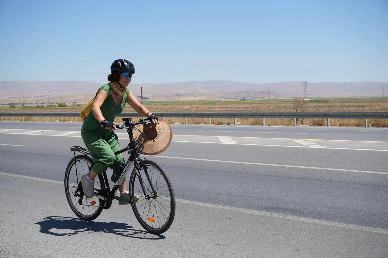 Kadınlara bisikleti tanıtıp farkındalık oluşturmak isteyen Eren, ovada denk geldiği Berivanlarla süt sağıp projesini tanıttı.