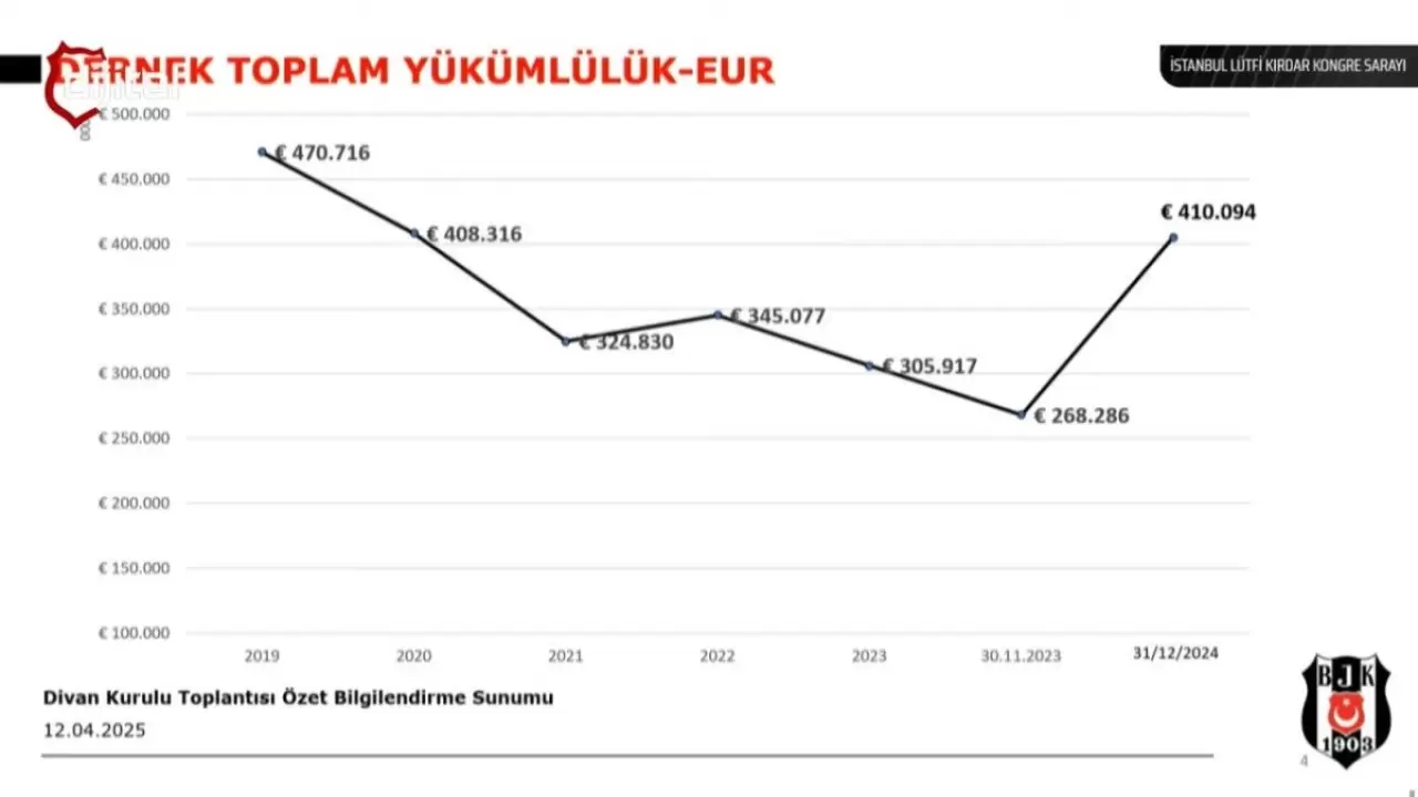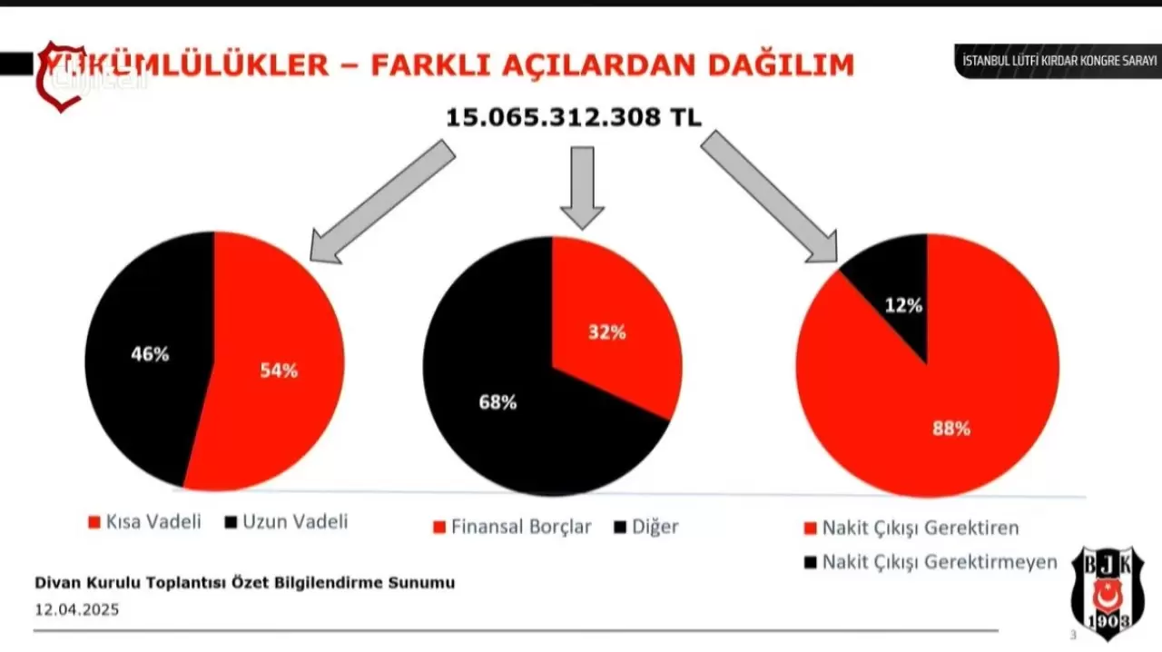 Siyah-beyazlı kulübün 31 Aralık 2024 tibariyle toplam borcunun 15 milyar 65 milyon 312 bin 308 TL olduğu belirtildi.