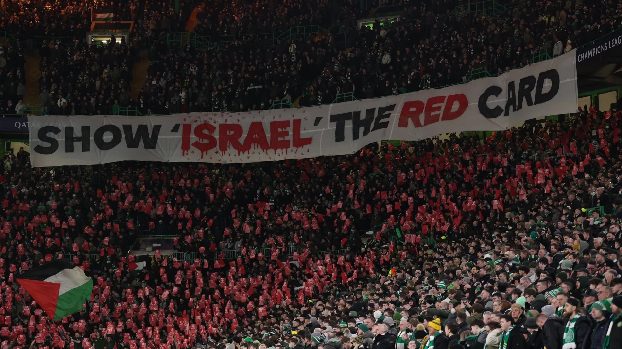 Celtic taraftarları, takımlarının UEFA Şampiyonlar Ligi'nde Bayern Münih’e 2-1 yenildiği maçta, İsrail’in Filistin ve Lübnan’a yönelik saldırılarına karşı protestolarını sürdürdü. Celtic Park'ta adeta Filistin’e destek verilen tribünler, İsrail’e karşı seslerini yükseltmeye devam etti.