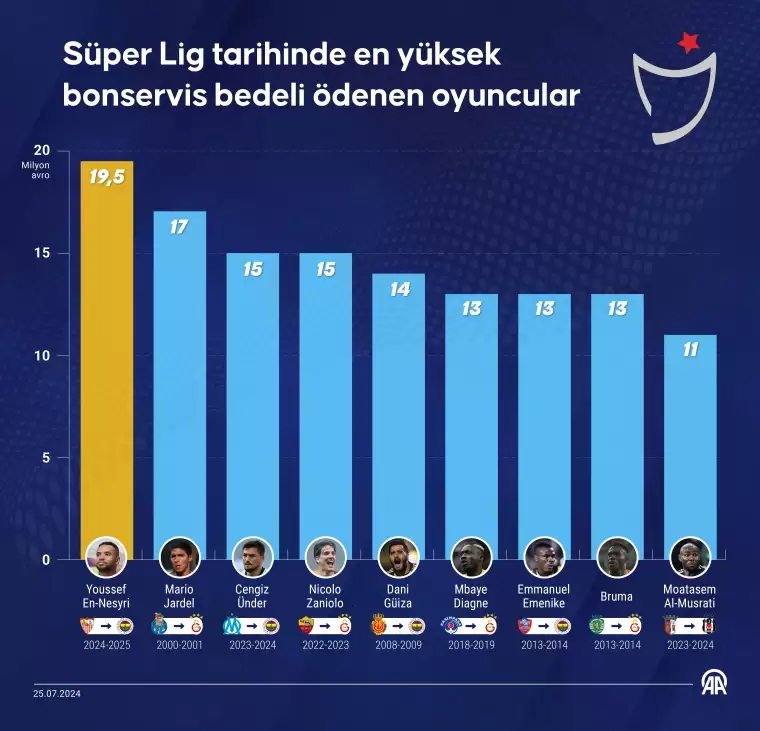 Türk futbolunda En-Nesyri ve Jardel'in ardından en yüksek bonservis bedeline transfer olan isimler, Fenerbahçe'nin geçen sezon kadrosuna kattığı Cengiz Ünder ve Galatasaray'ın 2022-2023 sezonunda transfer ettiği İtalyan futbolcu Nicolo Zaniolo oldu. Her iki oyuncu da 15 milyon avro bonservis ücretiyle dikkatleri üzerine çekti.