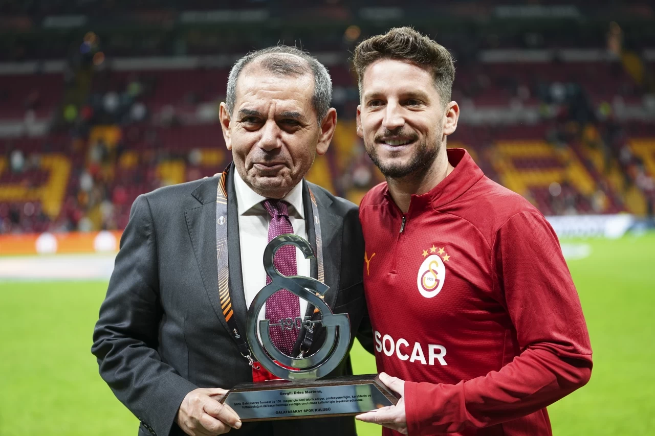Rams Park’ta Galatasaray ile Tottenham karşı karşıya geliyor. Karşılaşma öncesinde bugün 100. kez Galatasaray forması giyerek “dalya” diyecek Mertens'e Galatasaray Başkanı Dursun Özbek tarafından plaket takdim edildi.