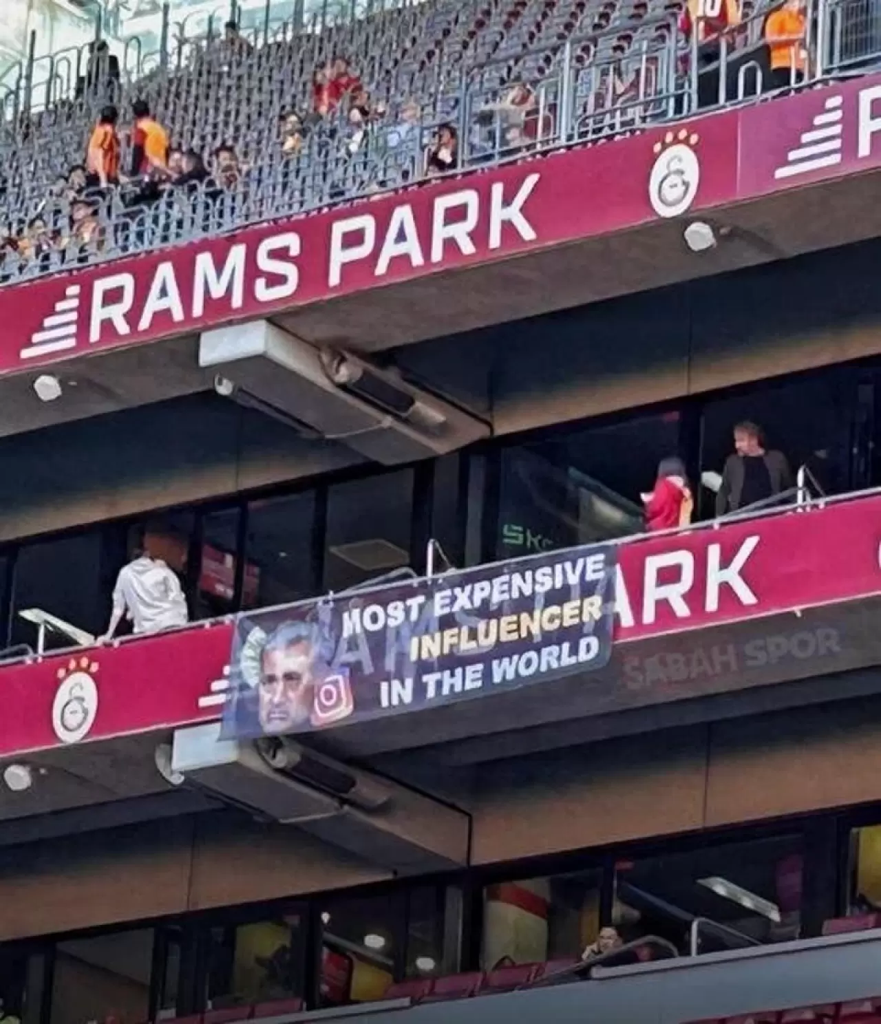 Galatasaraylı taraftarlar, maç öncesi RAMS Park'ta Jose Mourinho'ya yönelik, "Dünyanın en pahalı influencerı" pankartı açtı.