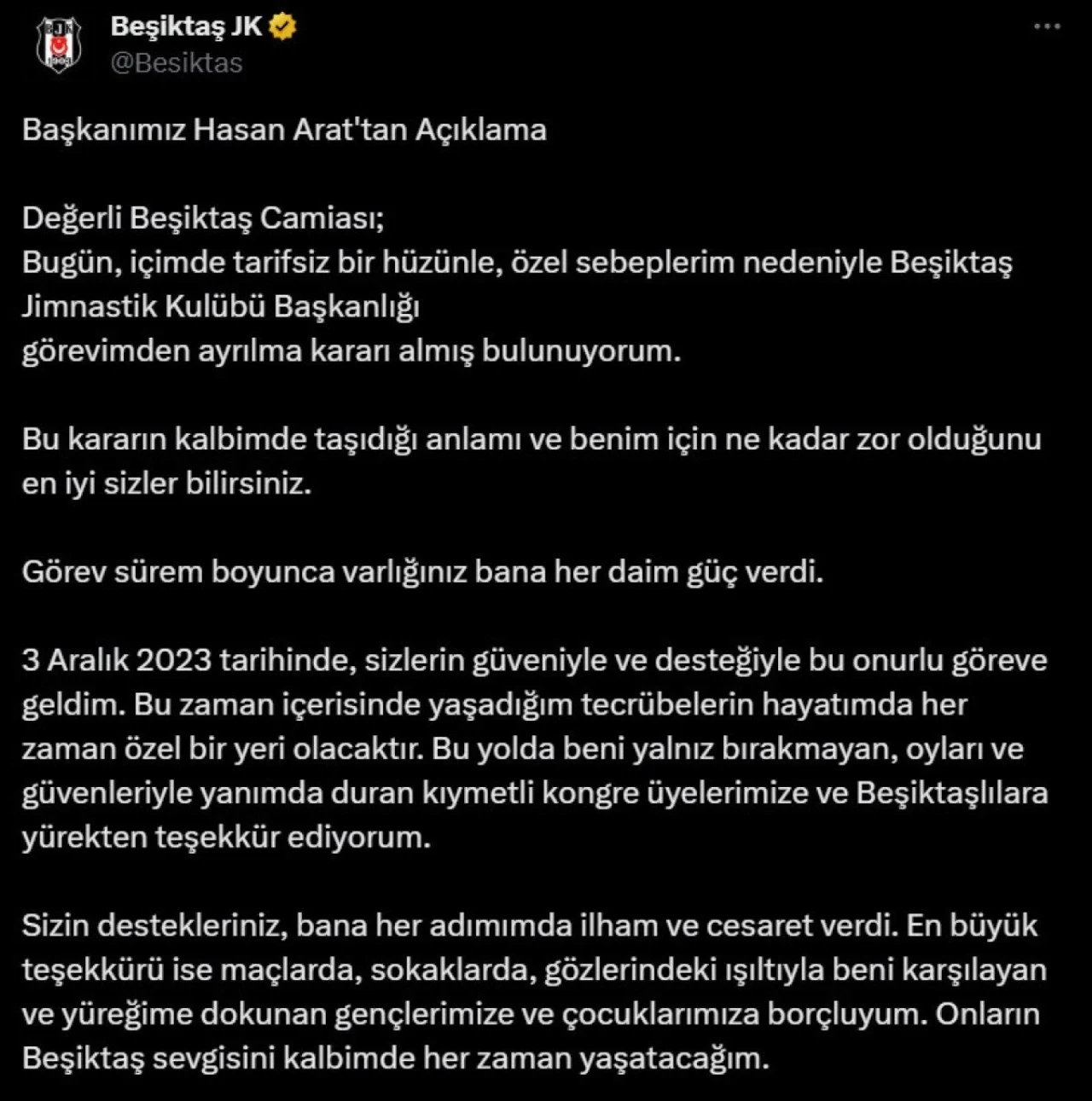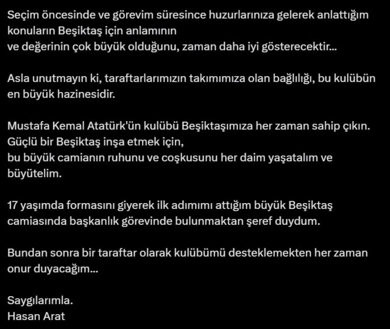 Beşiktaş Başkanı Hasan Arat, görevinden ayrılma kararı aldığını duyurdu.