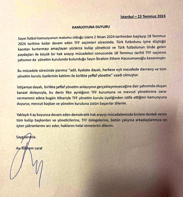 Saral'ın istifa ettiğine dair açıklama şu şekilde: