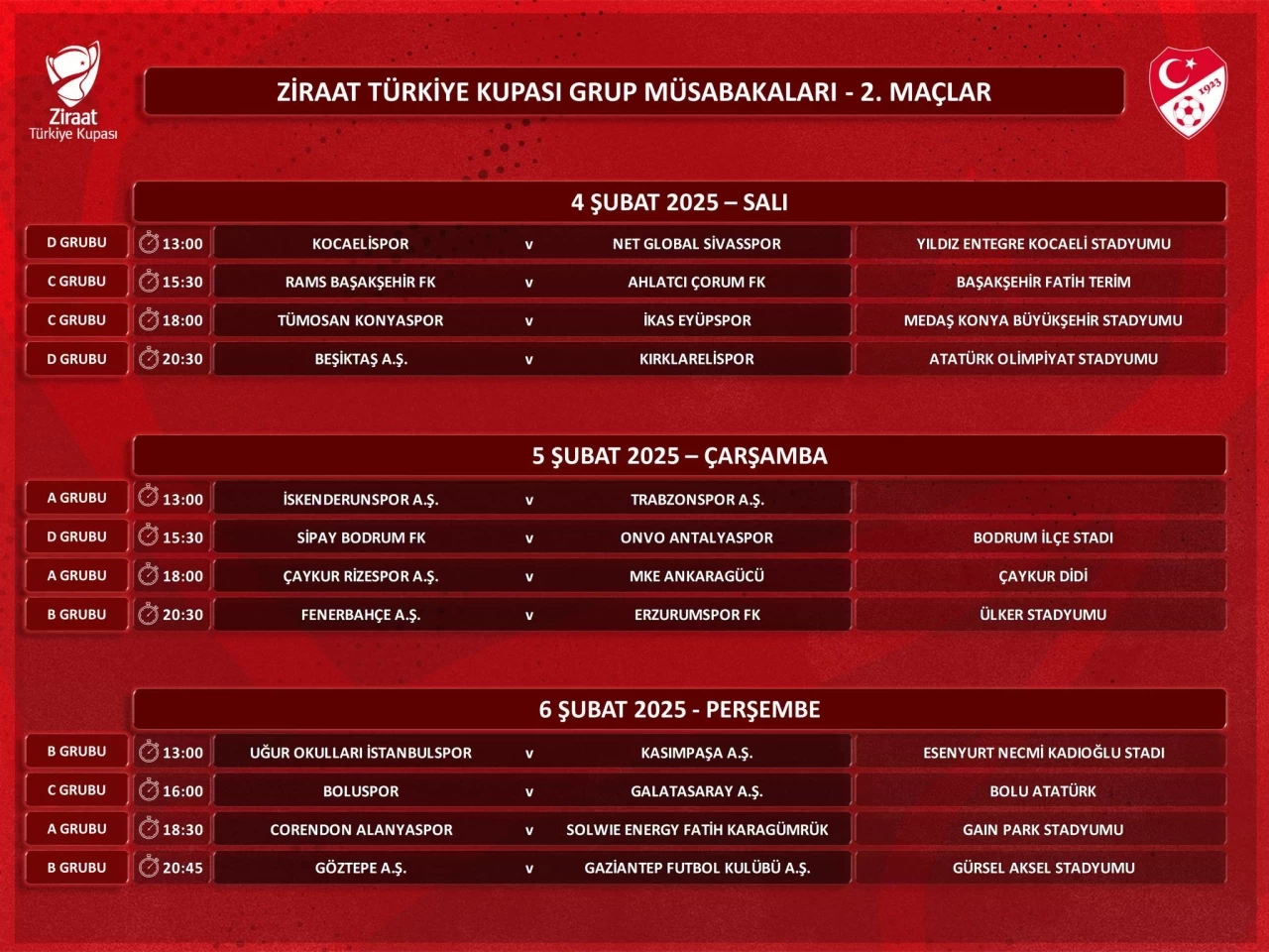 Ziraat Türkiye Kupası’nda grup aşamasının ikinci maçları, 4 Şubat’ta başlayacak. Takımlar, grup liderliği ve üst tura yükselmek için mücadele edecek.