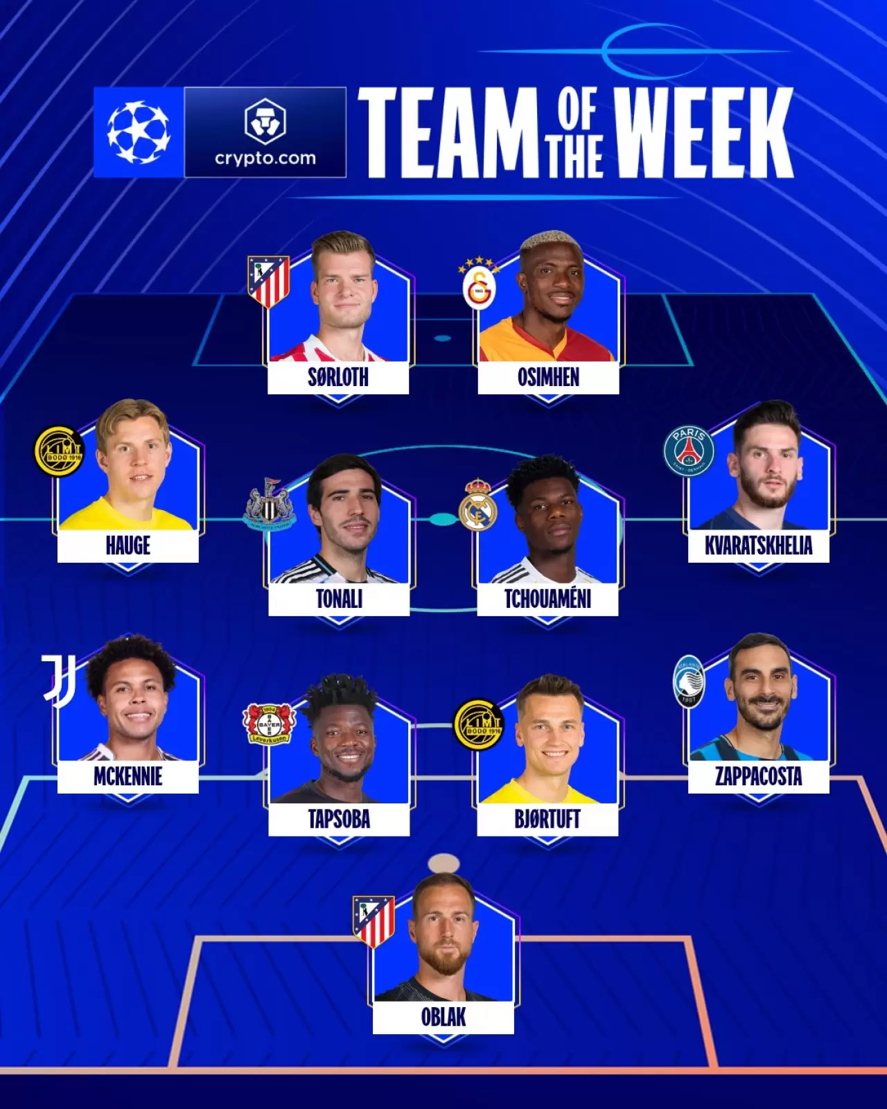 Jan Oblak (Atletico Madrid), Weston McKennie (Juventus), Edmond Tapsoba (Bayer Leverkusen), Odin Bjortuft (Bodo/Glimt), Davide Zappacosta (Atalanta), Jens Petter Hauge (Bodo/Glimt), Sandro Tonali (Newcastle), Aurelien Tchouameni (Real Madrid), Hviça Kvaratshelia (PSG), Alexander Sörloth (Atletico Madrid), Victor Osimhen (Galatasaray).