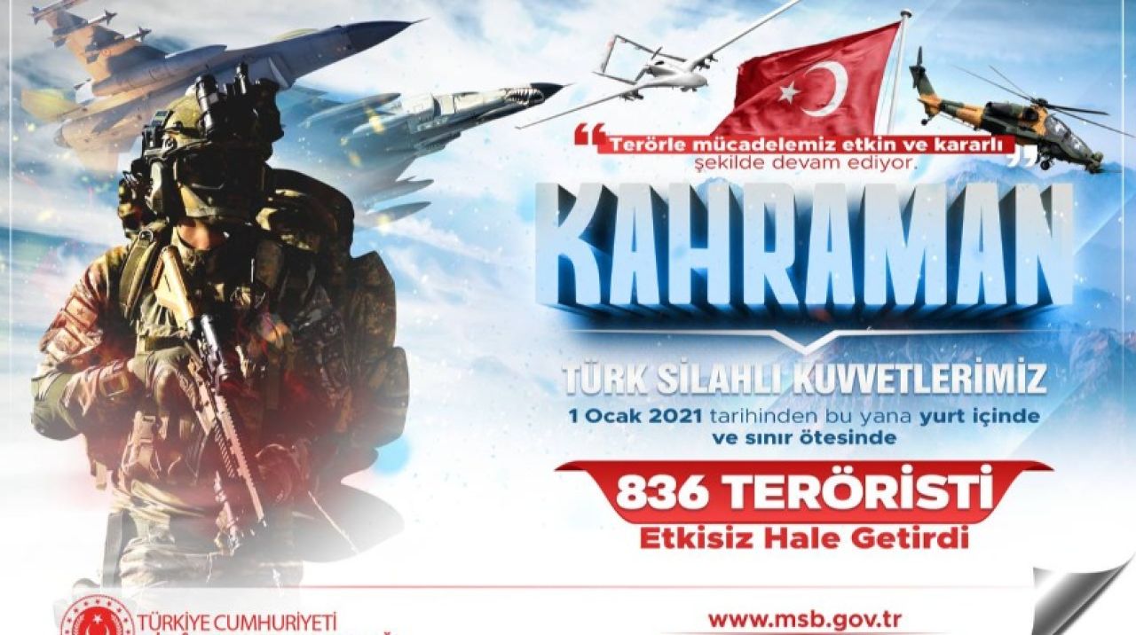 ''Kahraman Türk Silahlı Kuvvetlerimiz, teröristle mücadelesini etkin ve kararlı şekilde sürdürüyor. 1 Ocak 2021'den itibaren gerçekleştirilen operasyonlarda 836 terörist etkisiz hâle getirildi.''