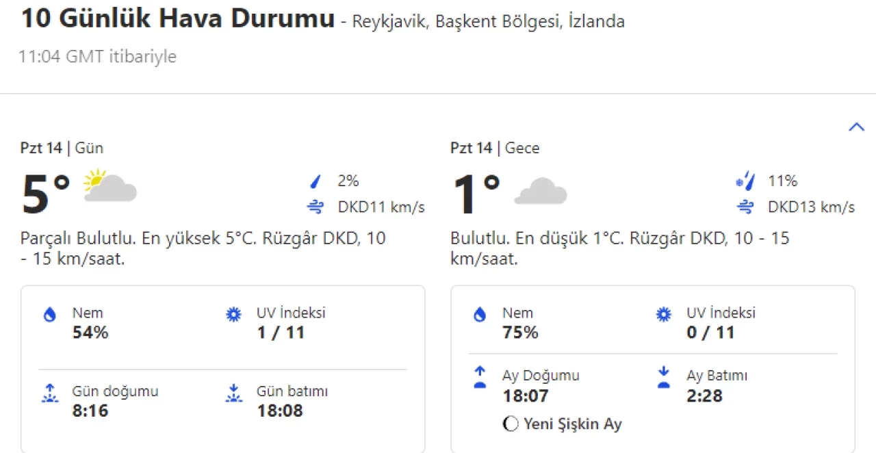 Türkiye ve İzlanda arasında düzenlenecek milli maç öncesi Reykjavik hava durumu merak edildi. 14 Ekim Pazartesi günü itibarıyla İzlanda'da hava durumu en düşük -4, en yüksek 5 derece olarak ölçülüyor. Yağış ihtimali ise görünmüyor. Havanın öğleden sonra ise bulutlu olacağı yönünde tahmin ediliyor.