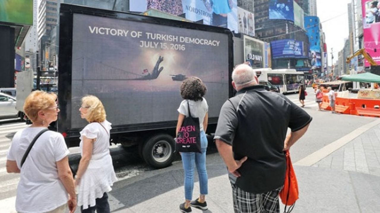 “Bu hain girişimi ve FETÖ yapılanmasının içyüzünü ABD’lilere göstermek amacıyla bugün New York’un en ünlü meydanı Times Meydan’da, dijital ekran panelleri olan bir kamyonet dolaştırıyoruz.” diyen Mutlu, şunları kaydetti: Yarın da The Network filminin gösterimi yapılacak. Umuyoruz ki, bu kamyonetteki görseller New York sokaklarında, Times Meydanı’nda dolaşan ABD’lilere ve turistlere, 15 Temmuz 2016 gecesi Türkiye’de neler olduğuna ve FETÖ yapılanmasının içyüzüne dair bir hatırlatma yapmış olur.