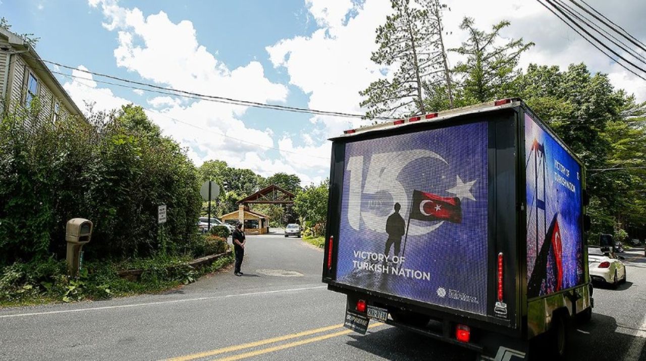 NEW YORK (AA) - Dijital ilan kamyonları ve sivil araçlardan oluşan konvoy, gün boyu, elebaşı Gülen’in bulunduğu Pensilvanya’daki çiftliğin önünde tur atarak hain darbe girişimini protesto etti.