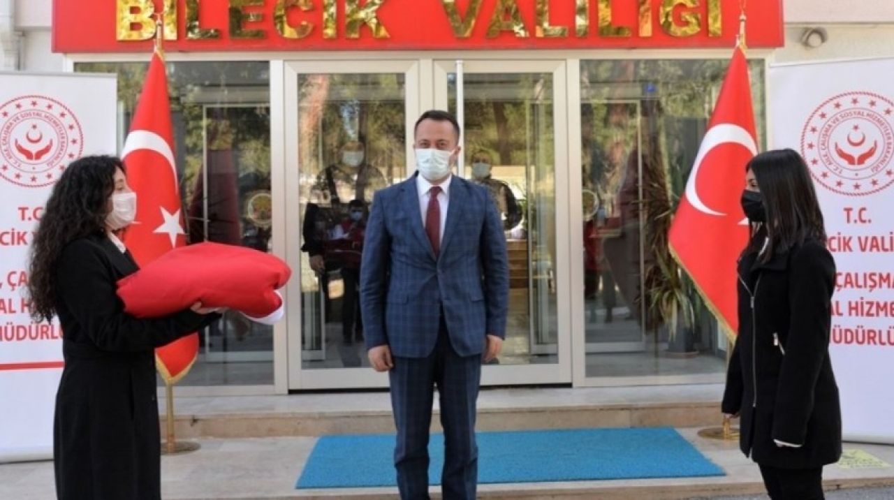 İHA - Aile, Çalışma ve Sosyal Hizmetler Bakanlığı tarafından Türkiye'nin 81 ilinde hayata geçirilen ''Anadolu Gönül Yolu-81 Genç 81 Bayrak'' etkinliği kapsamında 18 Mart Çanakkale Zaferi'nin 106'ncı yıldönümü ve Şehitler Günü dolayısıyla 7 bölgeden yola çıkan Türk bayrağı için Bilecik Valiliğinde devir teslim töreni düzenlendi. Bolu'dan şanlı Türk bayrağını Bilecik'e getiren Bolu İl Temsilcisi Hilal Yastık, ''Sevgili kardeşim, rengini atalarımızın kanlarından almış bu şanlı bayrak ulusumuzun bağımsızlık sembolüdür. Temsil edildiği her yerde kahraman ulusumuzun gurur kaynağı olmuştur. Onu teslim aldığım andan bu ana kadar gururla taşıdım. Sizin de bu kutsal emaneti koruyup, yücelteceğinize inanıyor, aldığım gibi öperek size teslim ediyorum'' diyerek Türk bayrağını Bilecik İl Temsilcisi Leyla Karağlı'ya teslim etti.