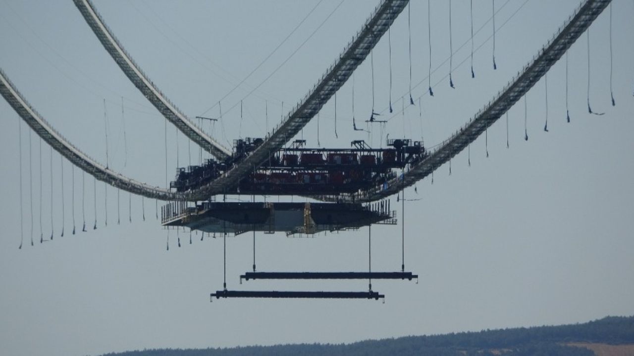 Her biri 45 metre genişliğinde, 48 metre uzunluğunda ve 700 ton ağırlığındaki tabliye bloklarının bağlanacağı askı halatlarının ana halatlara montaj işlemi 6 Temmuz Salı günü başlamıştı. Bugün de Asya ve Avrupa’daki kule ayaklarının orta açıklığına ilk mega tabliye bloğu yerleştirildi. Gemiyle getirilen tabliye, vinç yardımı ile yukarı kaldırılarak iki kule arasına montajı gerçekleştirildi.