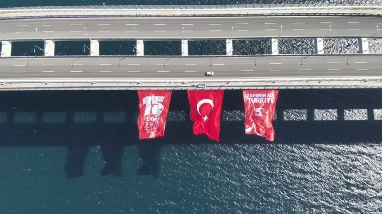 15 Temmuz hain darbe girişiminin 9'uncu yıl dönümü nedeniyle 1915 Çanakkale Köprüsü'ne dev bir Türk bayrağı, 15 Temmuz Derneği Bayrağı ve üzerinde "Zaferin Adı 15 Temmuz" yazılı bayrak asıldı.