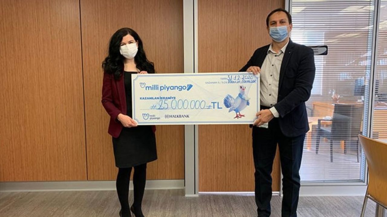 9884757 sayılarına isabet eden çeyrek Milli Piyango biletiyle 25 milyon TL kazanan adını vermek istemeyen talihliye çekini; Halkbank Levent Şube Müdürü ve Sisal Şans Müşteri Operasyonları Direktörü Özgür Yılmaz teslim etti.