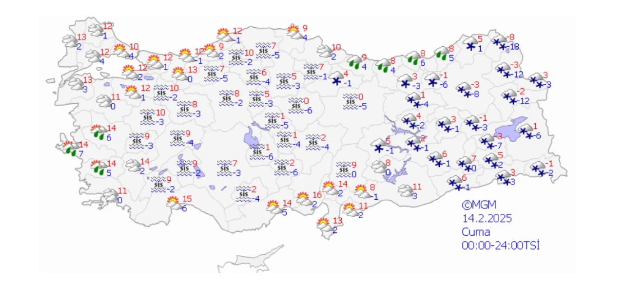Parçalı, yer yer çok bulutlu, öğle saatlerinden sonra (Muğla hariç) kıyı kesimlerinin aralıklı sağanak yağışlı geçeceği tahmin ediliyor. Bölgenin iç kesimlerinde buzlanma ve don olayı ile birlikte pus ve yer yer sis bekleniyor.
