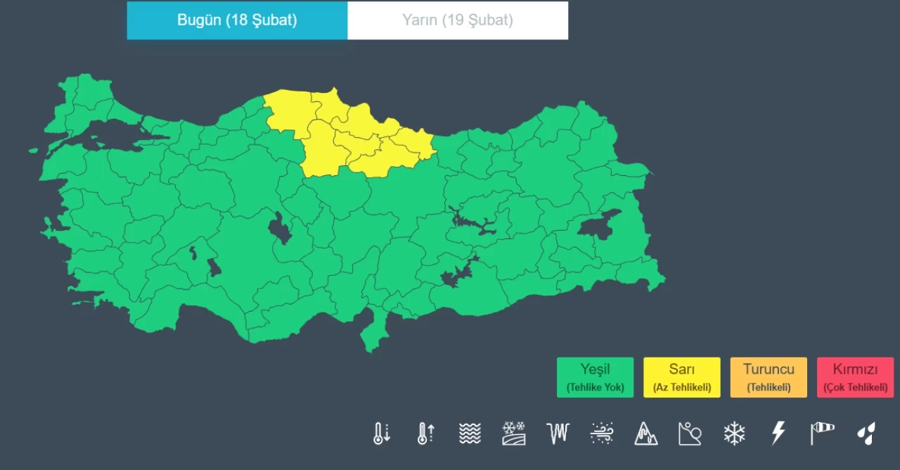 Batı Karadeniz’de rüzgarın kuzey yönlerden kuvvetli (40-60 km/saat) esmesi bekleniyor. İç ve doğu kesimlerde gece ve sabah saatlerinde buzlanma ve don olayı görülebilir.