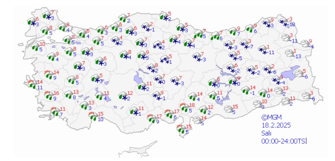 🌡️Hava Sıcaklığı: İç Ege, İç Anadolu ile Karadeniz kıyılarında 2-4 derece azalacağı, diğer yerlerde önemli bir değişiklik olmaması bekleniyor. pic.twitter.com/GPK70eMHWh— Meteoroloji (MGM) (@meteoroloji_twi) February 18, 2025