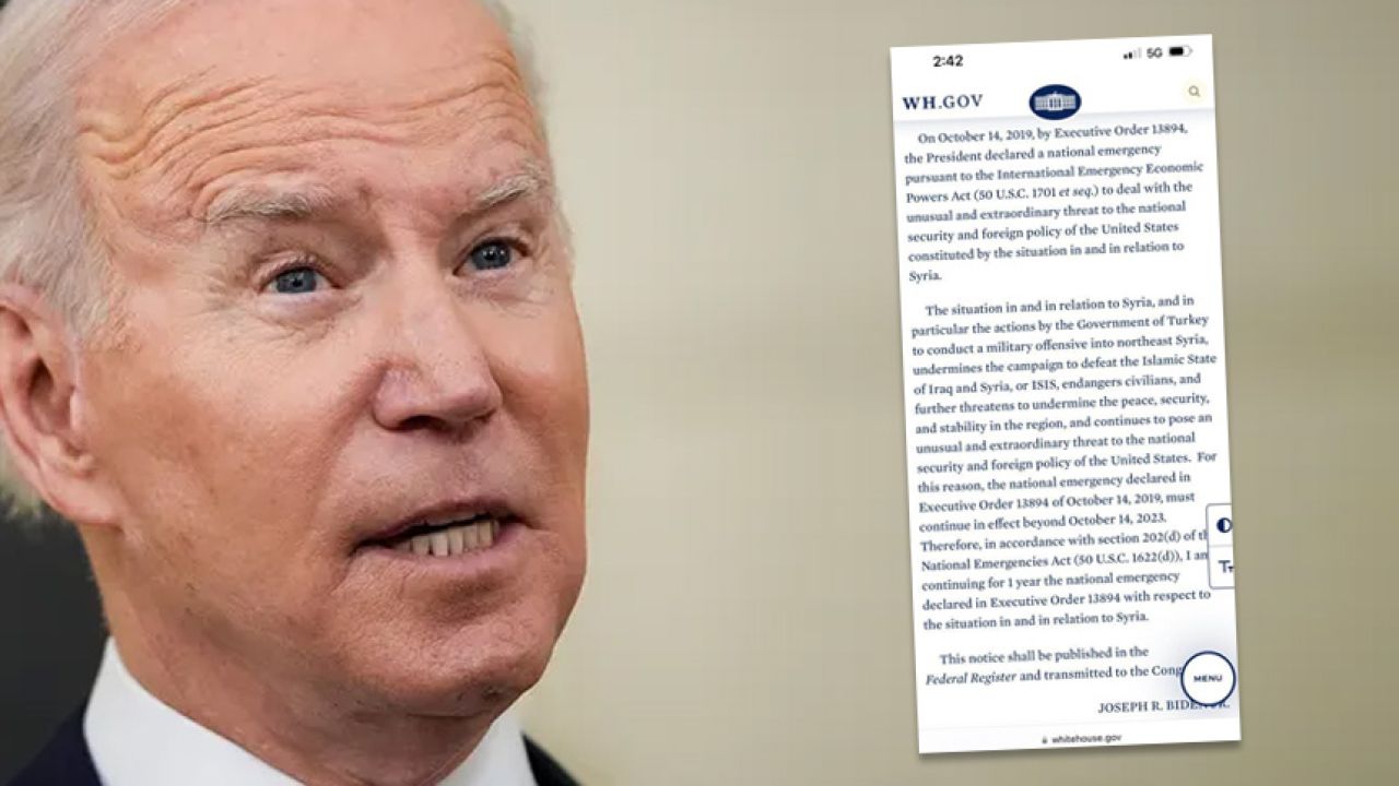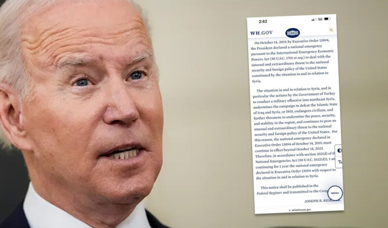 Beyaz Saray'dan paylaşılan bildiriye göre, Biden, Suriye'nin içindeki gelişmeler ve bu ülke kaynaklı ABD ulusal güvenliği ve dış politikasına yönelik "alışılmadık ve olağanüstü" tehditle başa çıkmak üzere 14 Ekim 2019'da ilan ettiği başkanlık kararnamesinin süresini uzatacağı konusunda Kongre'yi bilgilendirdi.