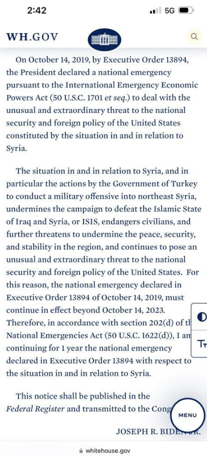 Biden, "özellikle Türk hükümetinin Suriye'nin kuzeydoğusuna askeri harekat için attığı adımların bölgedeki barışı, istikrarı ve güvenliği tehdit ettiğini, DEAŞ ile mücadeleyi zayıflattığını" savunarak, Suriye içindeki ve Suriye'yi ilgilendiren mevcut durumun "ABD'nin ulusal güvenliği ve dış politikasına alışılmadık ve olağanüstü bir tehdit" oluşturmaya devam ettiğini ileri sürdü.