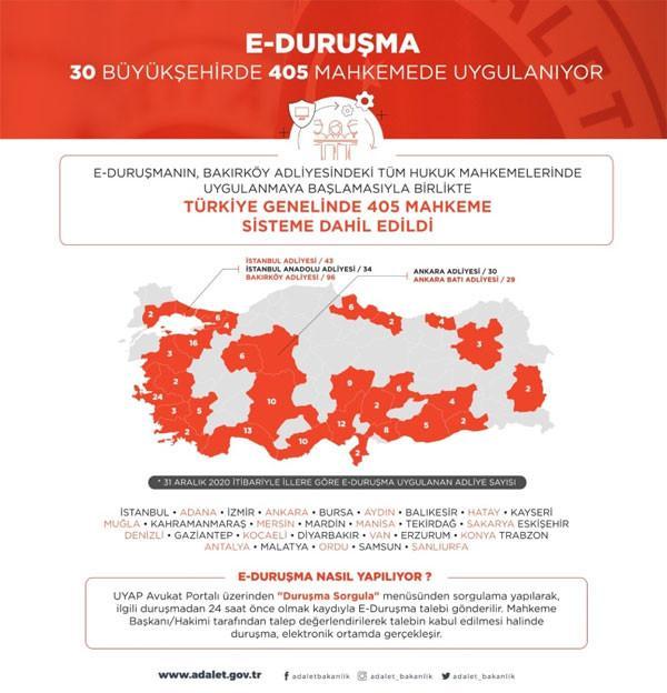 Avukatların hukuk mahkemelerinde taraf oldukları duruşmalara bulundukları yerlerden video konferansla katılmalarını sağlayan e-duruşmanın kapsamı genişledi. E-duruşmanın uygulandığı 30 büyükşehirdeki mahkemelere 76 mahkeme daha katıldı. Böylece e-duruşmanın uygulandığı mahkeme sayısı 405’e yükseldi. Sistem İstanbul Bakırköy ve Ankara Batı Adliyesindeki hukuk mahkemelerinin tamamında uygulanmaya başlandı.
