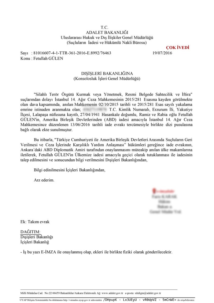 Diğer taraftan, FETÖ elebaşı Gülen’in iade dosyalarına ilişkin olarak ABD makamlarınca talep edilen ek bilgiler de eksiksiz olarak gönderilmiştir. İade süreci kapsamında Adalet Bakanı Sayın Bekir Bozdağ tarafından 26 Ekim 2016 ve 8 Mayıs 2017 tarihlerinde ABD’ye ziyaretler gerçekleştirilmiş, ABD Adalet Bakanına hitaben 5 Ağustos 2016 ve 14 Şubat 2017 tarihli mektuplar sunulmuş, ayrıca ABD Adalet Bakanı ile 21 Mart 2017 tarihinde telefon görüşmesi gerçekleştirilmiş; Önceki Dönem Adalet Bakanı Sayın Abdulhamit Gül de 12 Haziran 2019 tarihinde ABD’ye ziyaret gerçekleştirmiş, bu vesilelerle pek çok kere FETÖ elebaşının iadesine yönelik haklı taleplerimiz vurgulanmıştır.