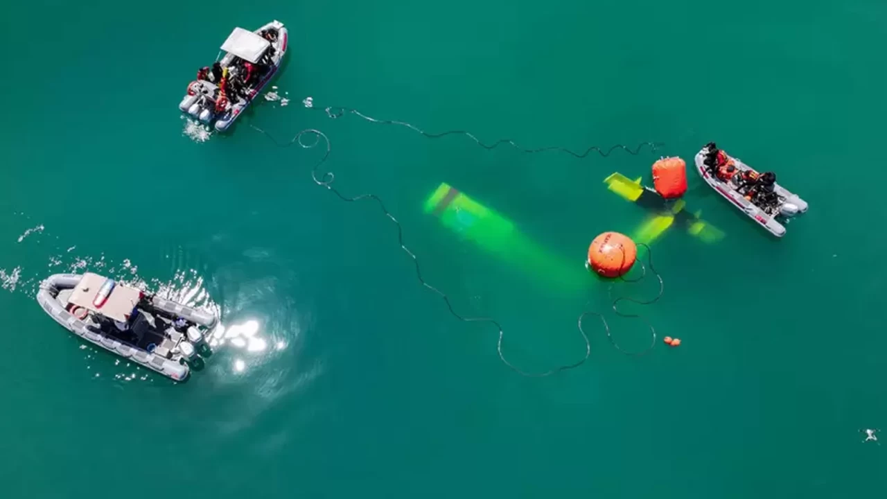 Ekipler, 27 metre derinlikteki uçak enkazını, kaldırma balonlarıyla su yüzeyine çıkardı.