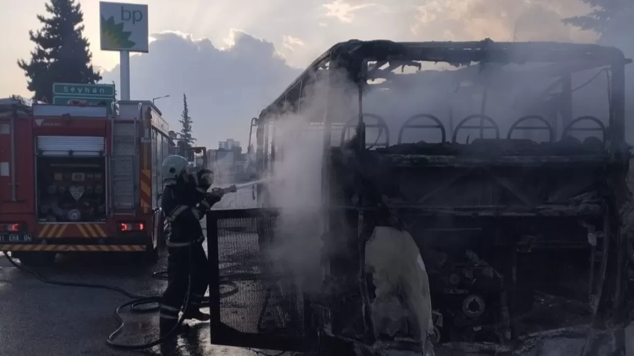 Yangın sonucu toplu taşıma aracından geriye demir yığını kaldı. Polis yangınla ilgili inceleme başlattı.