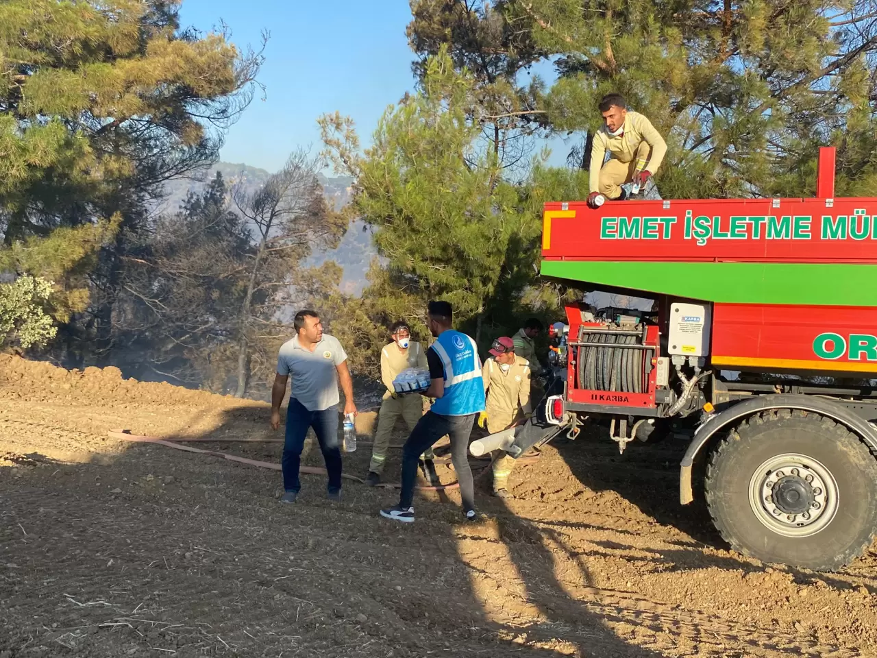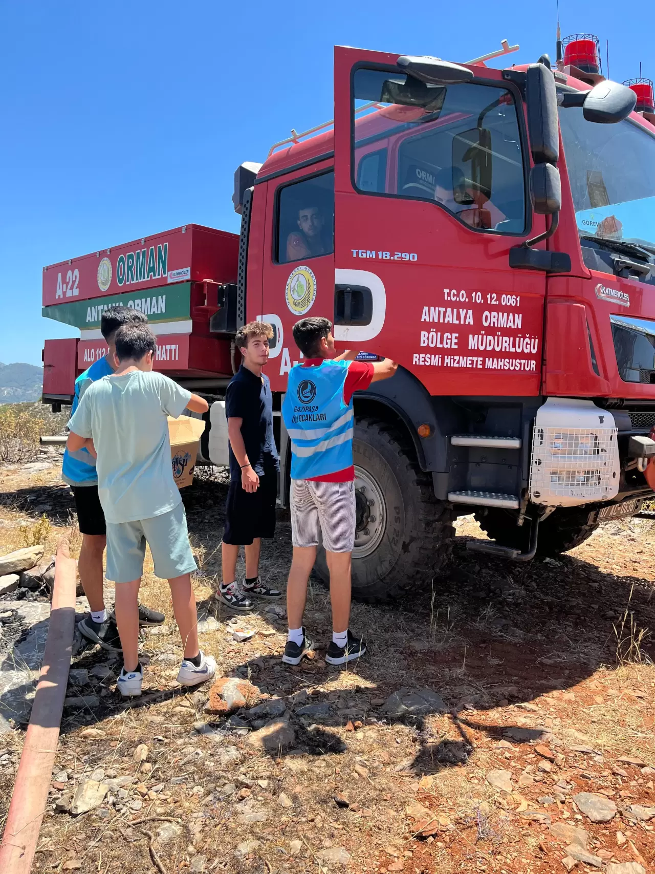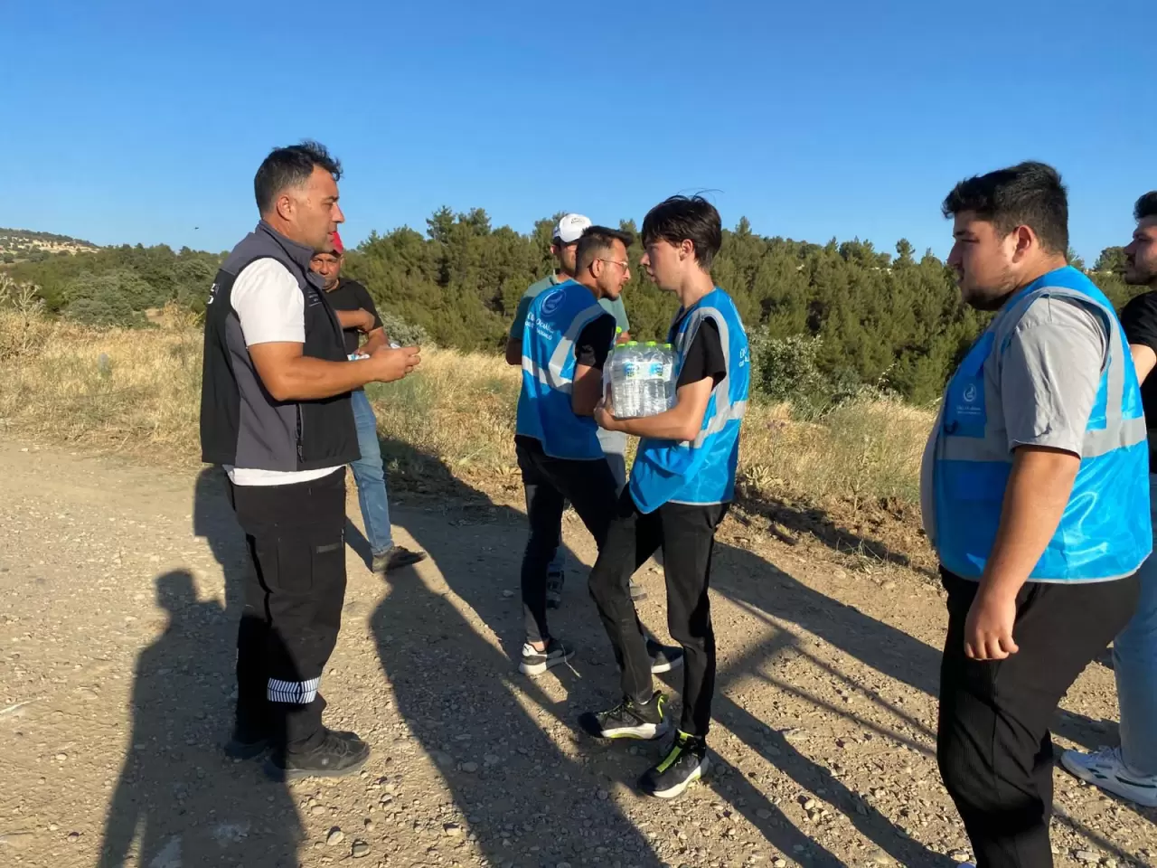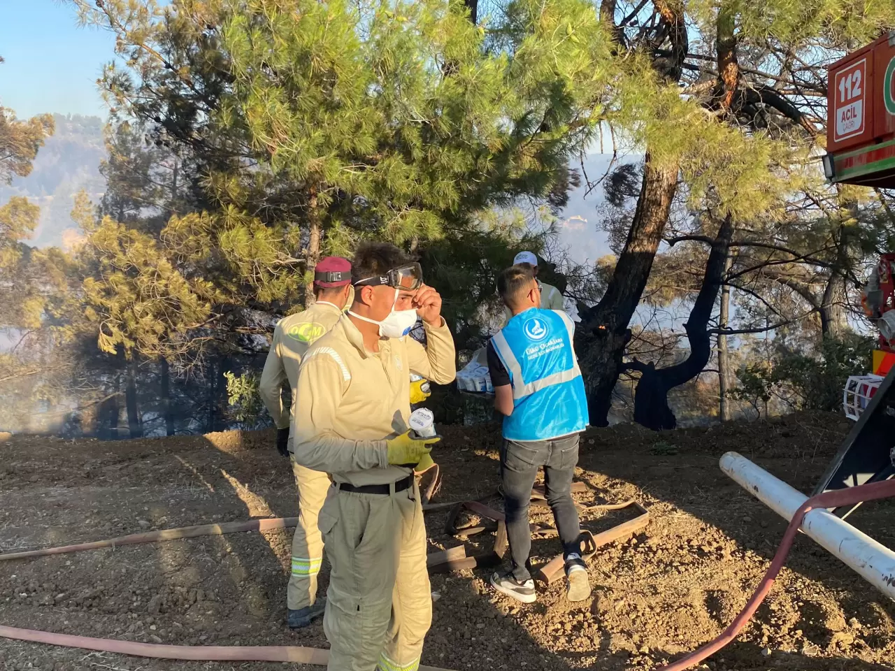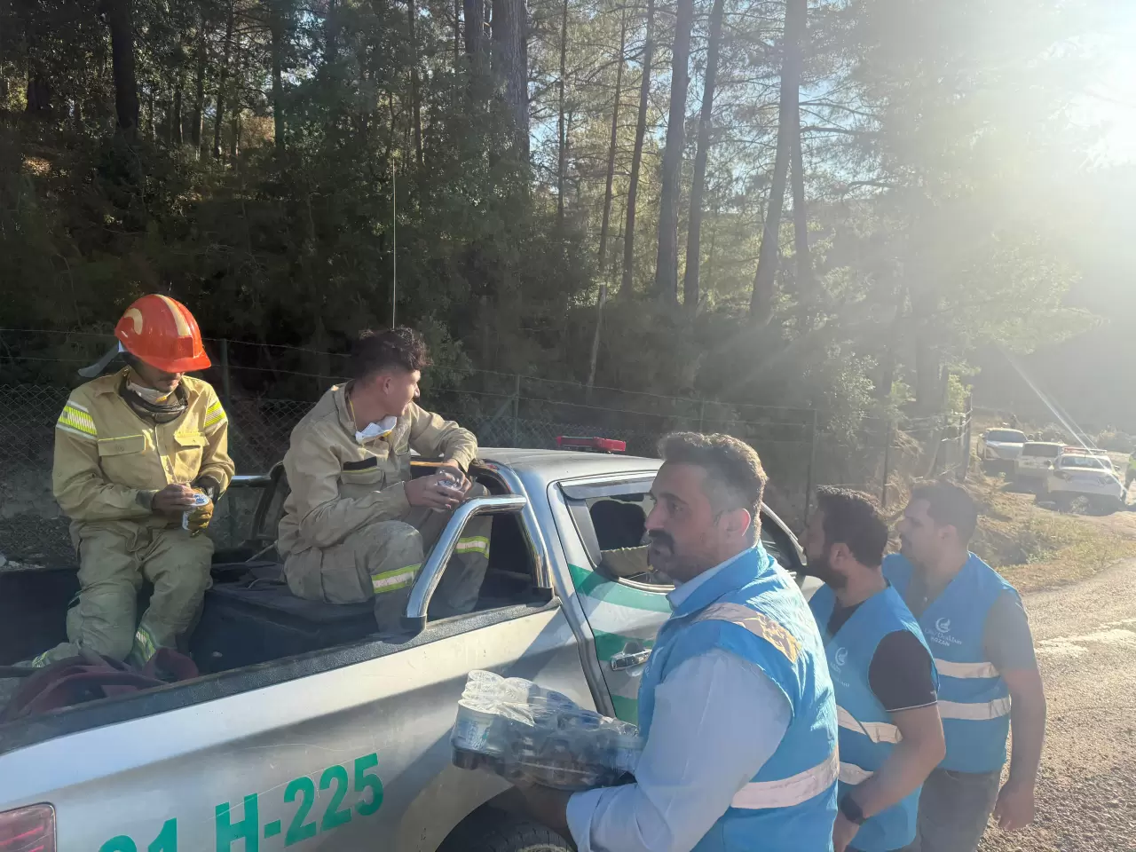 Yangının büyümesini önlemek amacıyla yangın sahasına ulaşanlar, bir yandan söndürme faaliyetlerine destek olurken, diğer yandan sahada görev yapan personel ve gönüllülere su ikramında bulunarak lojistik destek sağladı.