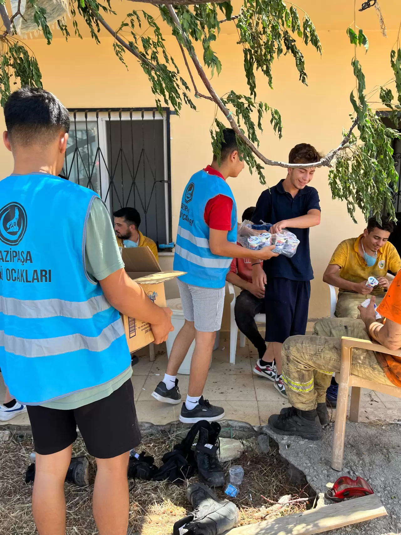 Gazipaşa’da yangının başladığı ilk andan itibaren bölgeye ulaşan ekiplerimiz, itfaiye erlerine lojistik destek sağladı. Yangın söndürme çalışmalarının yanında, ekipler tarafından itfaiyecilere su, ayran ve çeşitli ikramlarda bulunularak moral desteği verildi.