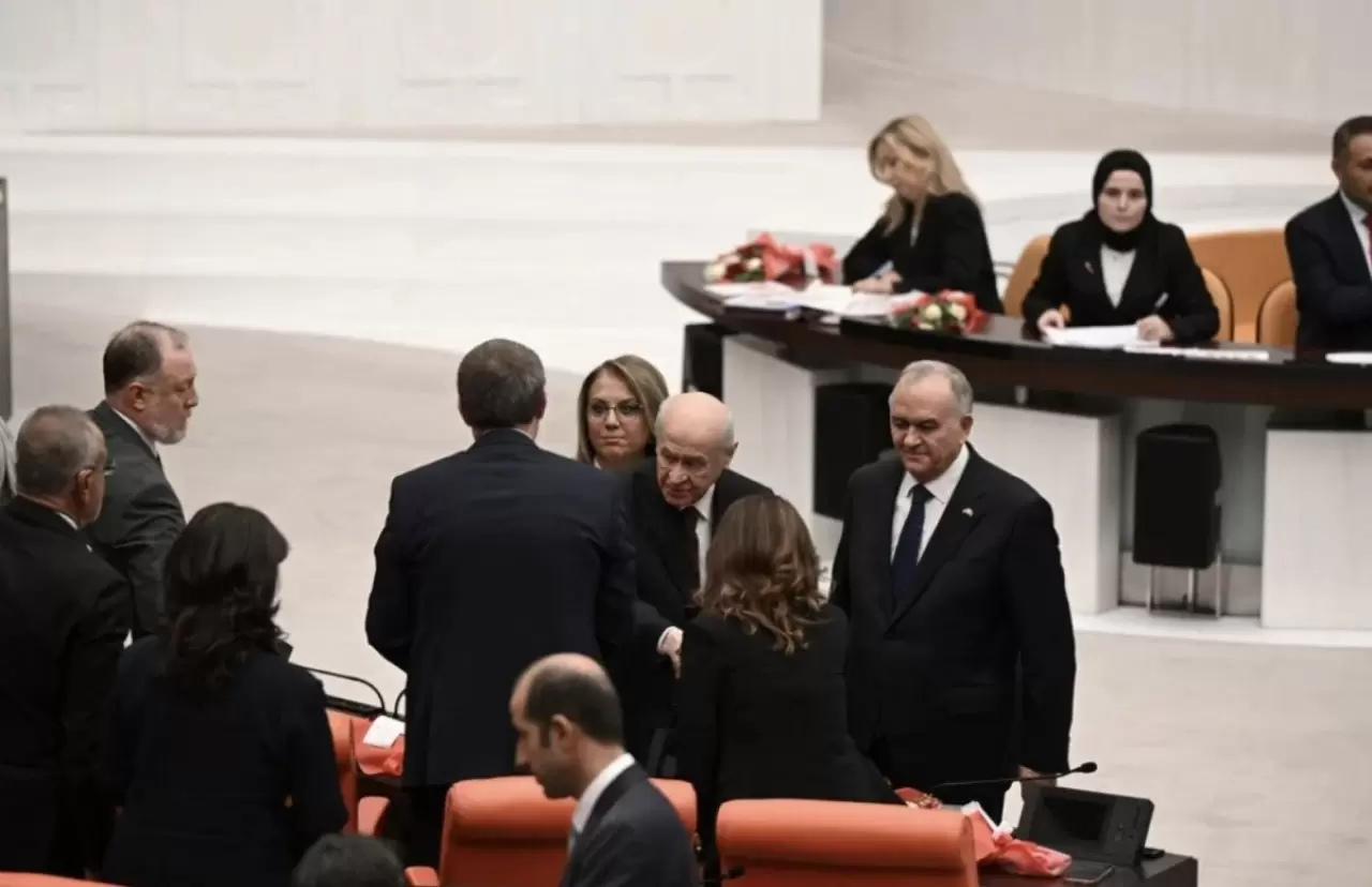 Bahçeli'nin burada DEM Parti Eş Genel Başkanı Tuncer Bakırhan, DEM Parti Grup Başkanvekili Sezai Temelli, DEM Parti Van Milletvekili Pervin Buldan ve DEM Parti Ağrı Milletvekili Sırrı Sakık'ın da aralarında bulunduğu isimlerle tokalaşma anları kameralara yansıdı.