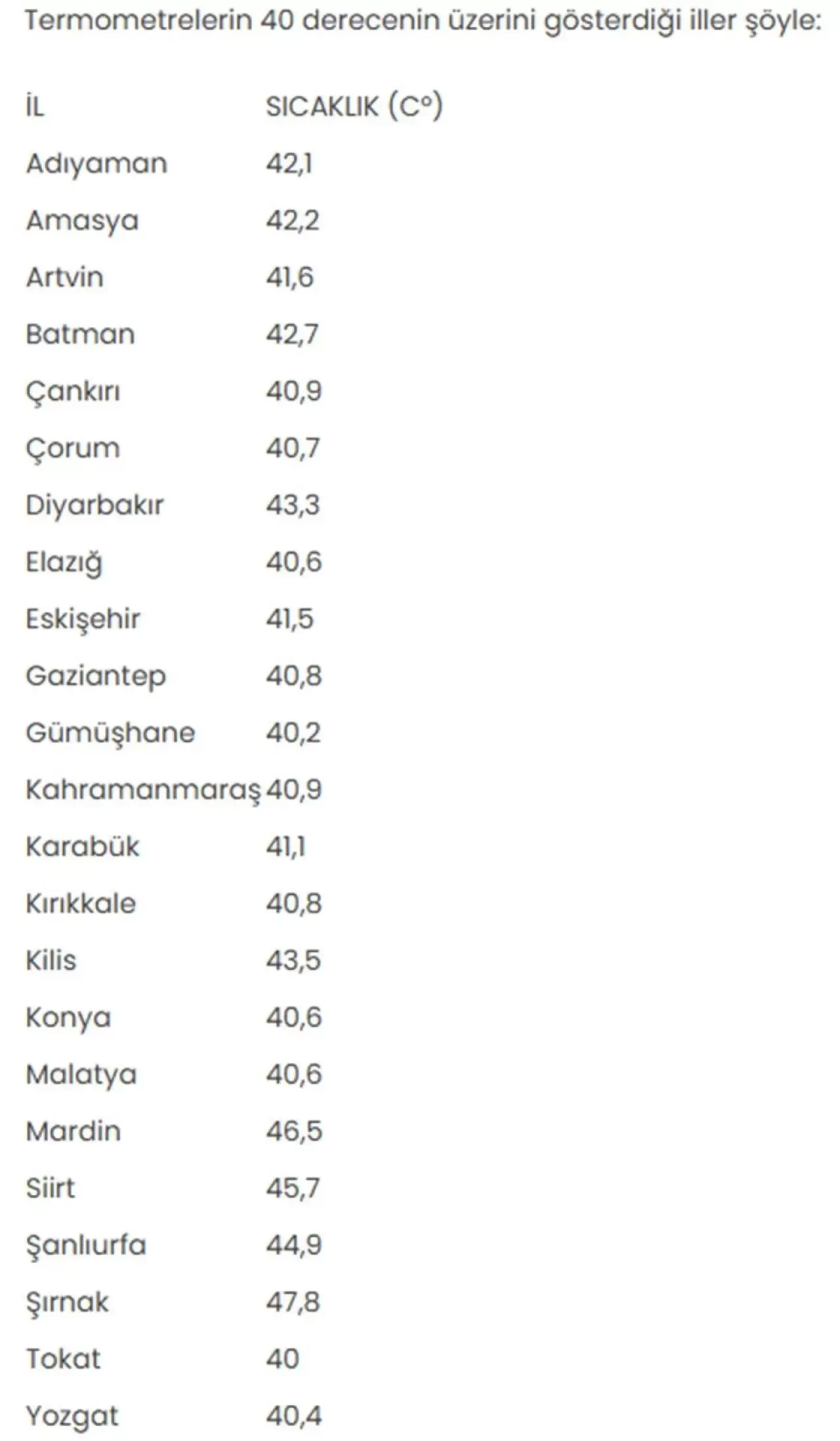 En yüksek sıcaklık Şırnak'ta 47,8 derece olarak kayıtlara geçti. Bunu 46,5 dereceyle Mardin, 45,7 dereceyle Siirt izledi.