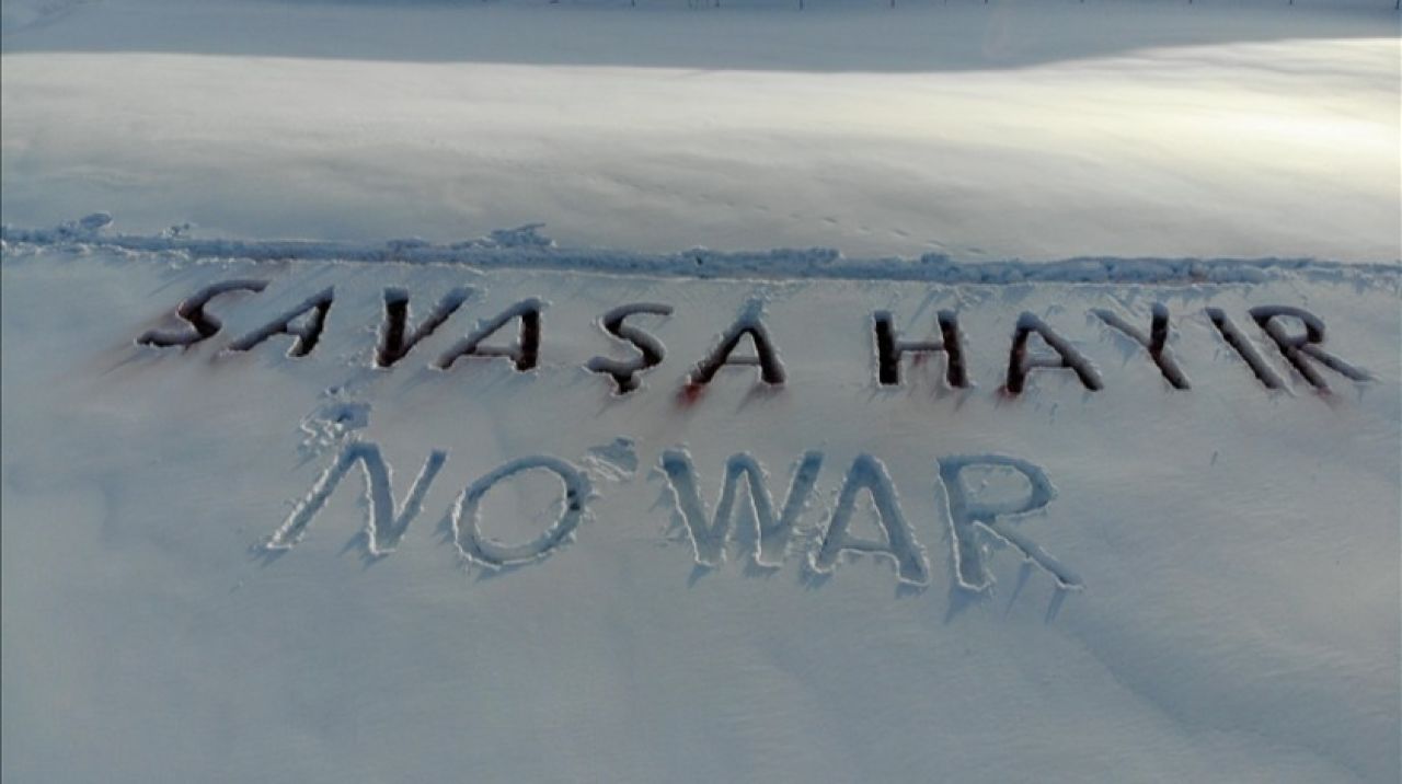 Ağrı İbrahim Çeçen Üniversitesinde (AİÇÜ) görevli heykeltıraş Naci Edi ve öğrencileri, farkındalık oluşturmak için bir dağın yamacındaki karın üzerine toz boyalarla Türkçe ve İngilizce olarak dev "savaşa hayır" yazısı yazdı.