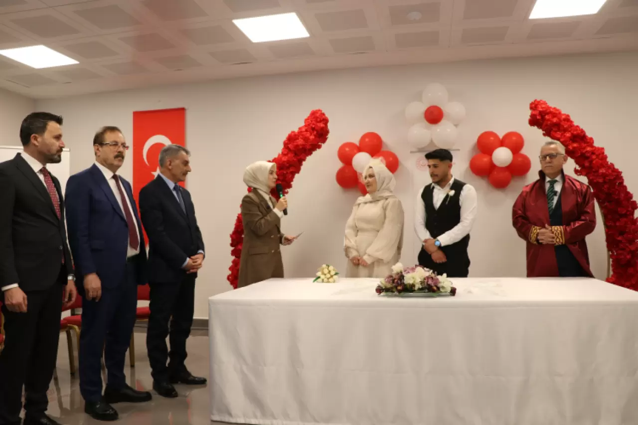 "Evlenecek Gençlerin Desteklenmesi Projesi" kapsamında evlilik kredisi almaya hak kazanan İrem Seda Ortataş ve Ömer Karakoç'un Aile ve Sosyal Hizmetler İl Müdürlüğünde düzenlenen nikah törenine katılan Bakan Göktaş, çiftin nikah şahitliğini yaptı.