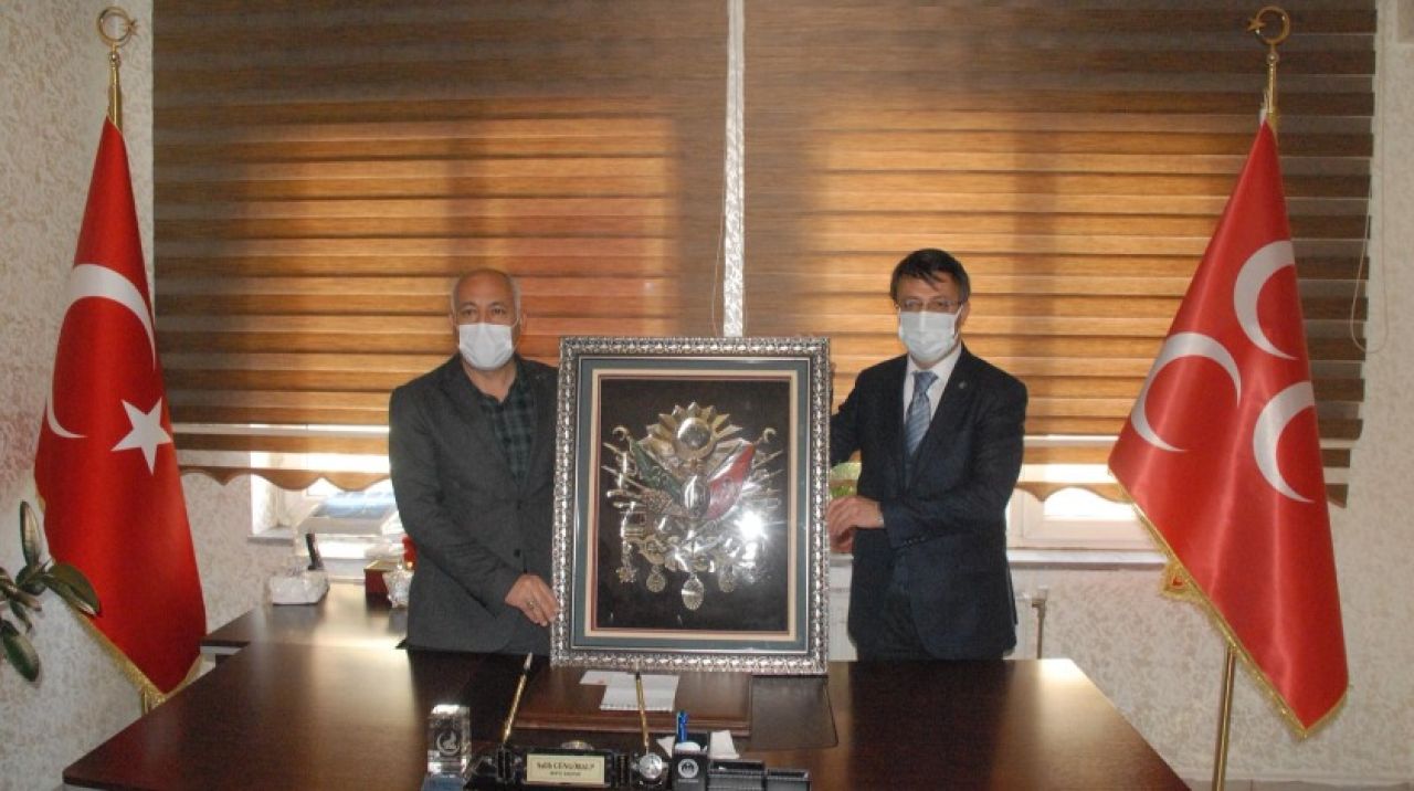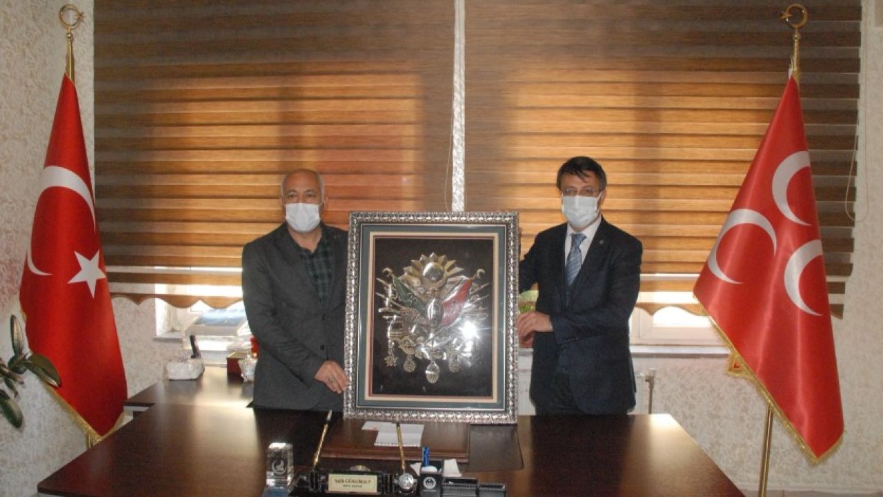 Yapılan ziyaretin sonunda AK Parti İl Başkanı Kayhan Türkmenoğlu tarafından MHP Van İl Başkanı Salih Güngöralp’a günün anısına Osmanlı Tuğralı tablo hediye etti.