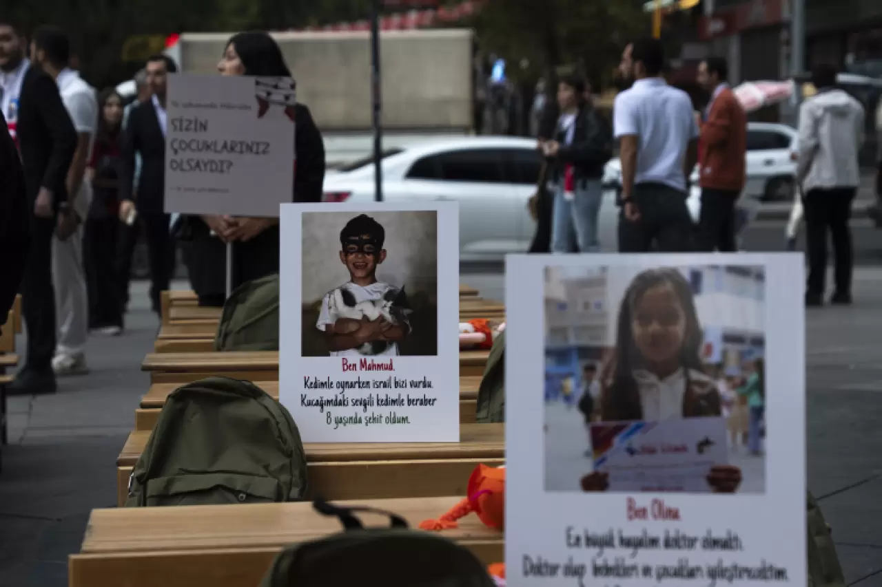 İsrail'in 7 Ekim 2023'ten bu yana 19 bin çocuğu öldürdüğünü belirten İbiş, "O çocukların çantaları kapının arkasında asılı kaldı. Defterleri hiç açılmadı, kalemleri hiç yazmadı. Hayatları katil İsrail'in bombalarıyla ellerinden alındı. Gazze'de yüzlerce okul yerle bir edildi, sınıflar enkaza döndü, kütüphaneler kül oldu. Çocukların umutla beklediği teneffüs zilinin yerini bombaların uğursuz sesi aldı." ifadelerini kullandı.