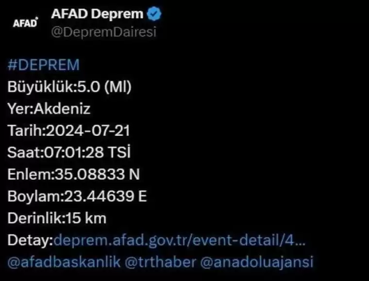 Saat 07.01 sıralarında Akdeniz'de Girit Adası açıklarında bir deprem meydana geldi. 5 büyüklüğündeki depremin derinliği 15 km olarak açıklandı.