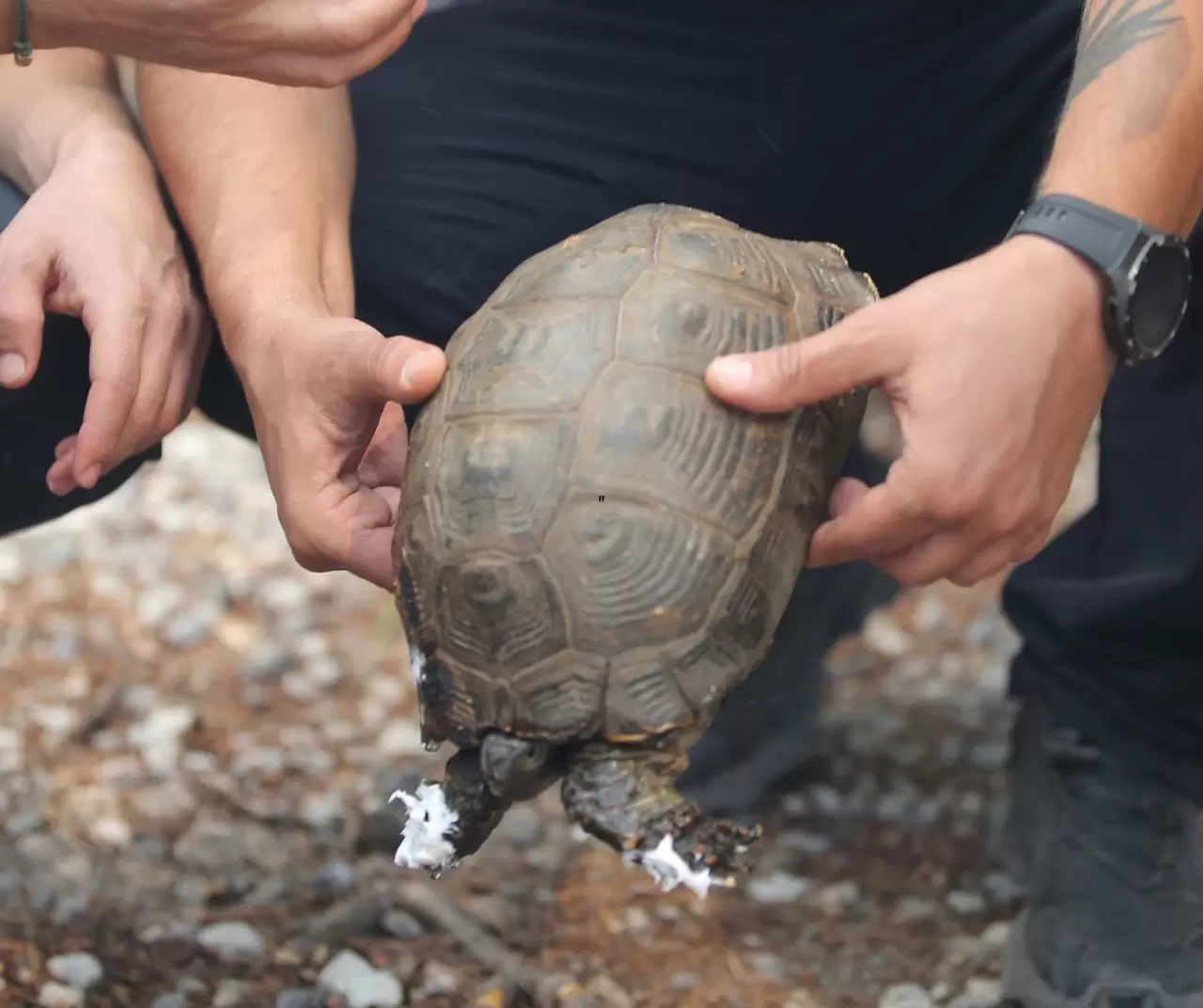 Muğla'nın Köyceğiz ilçesindeki orman yangınında, alevler arasında kalan bir kaplumbağa UMKE ekipleri tarafından kurtarıldı. Tedavi edilen kaplumbağa, Doğa Koruma ekiplerine teslim edilecekken, yangın kontrol altına alınmaya çalışılıyor.