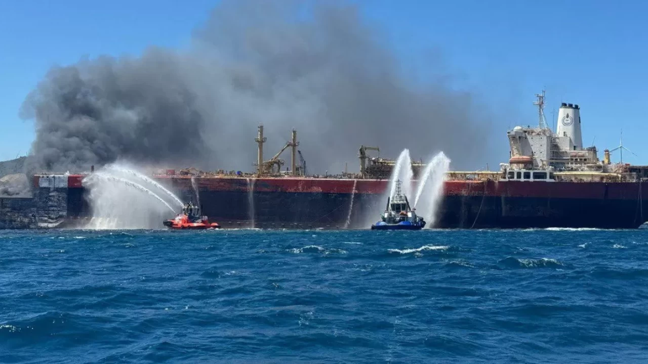 Römorkörler de denizden gemiye su ve köpük püskürtüyor.