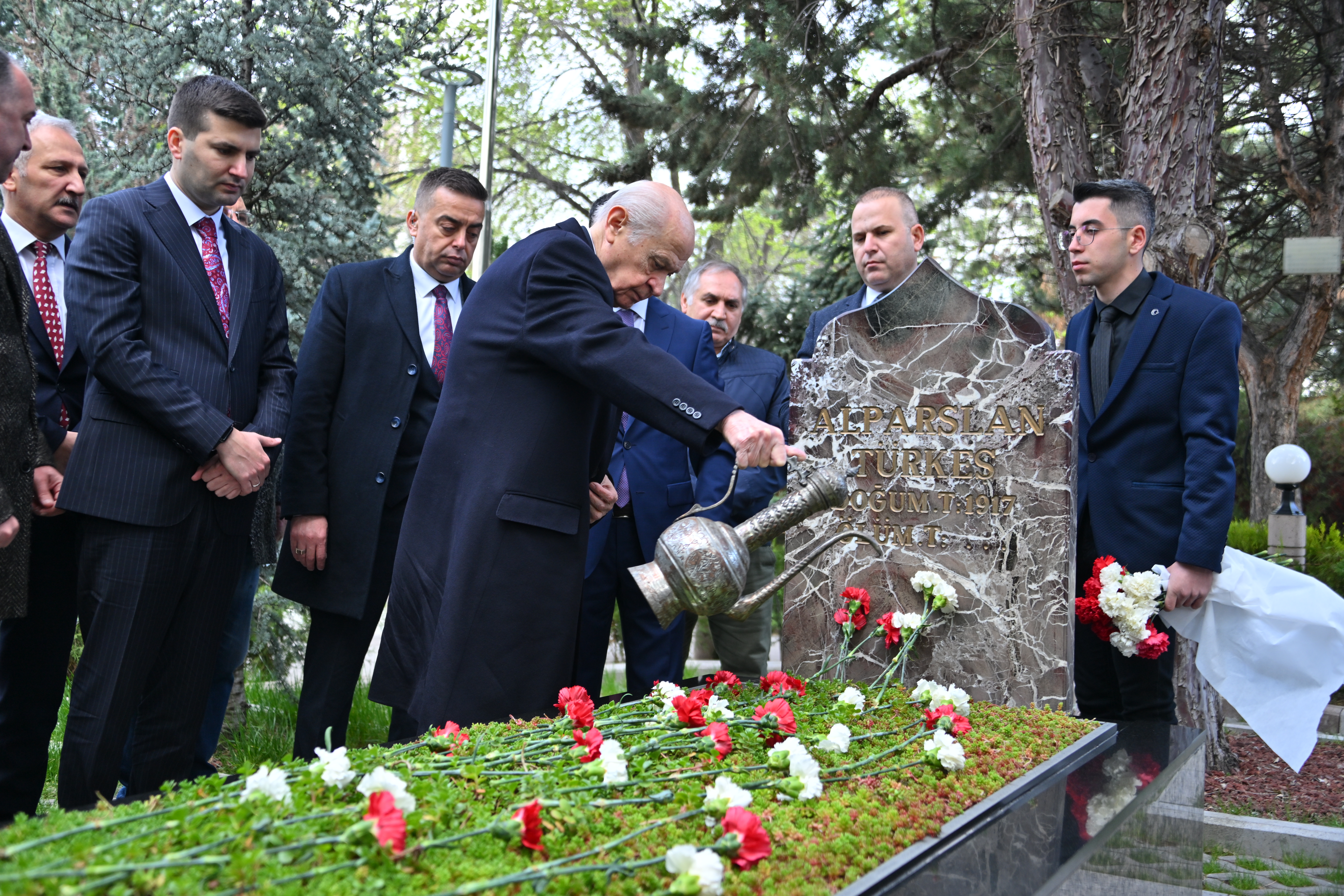 Bahçeli, Kur'an-ı Kerim tilavetinin ardından Türkeş'in kabrine karanfil bıraktı, bakır ibrikle su döktü.